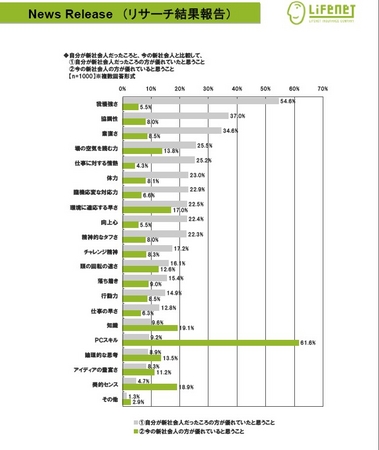 次に同回答者に対し、今の新社会人と比較して「今の新社会人の方が優れていると思うこと」と「自分が新社会人だったころの方が優れていたと思うこと」をそれぞれ聞いたところ、「今の新社会人の方が優れていること」の項目でトップとなったのは「PCスキル」(新社会人:61.6%、現社会人:9.2%、差:52.4ポイント)で、2位「知識」(新社会人:19.1%、現社会人:9.6%、差:9.5ポイント)、3位「美的センス」(新社会人:18.9%、現社会人:4.7%、差:14.2ポイント)となりました。一方、「自分が新社会人だったころの方が優れていた」の項目で1位になったのは、「我慢強さ」(現社会人:54.6%、新社会人:5.5%、差:49.1ポイント)、2位「協調性」(現社会人:37.0%、新社会人:8.0%、差:29.0ポイント)、3位「素直さ」(現社会人:34.6%、新社会人:8.5%、差:26.1ポイント)となり、新社会人に必要な3大要素の同様の項目である「協調性」と「素直さ」の2項目が上位にランクインする結果となり、新社会人に求める要素は、かつて自分が新社会人だったころの方が優れていたと感じている要素となっているようです。