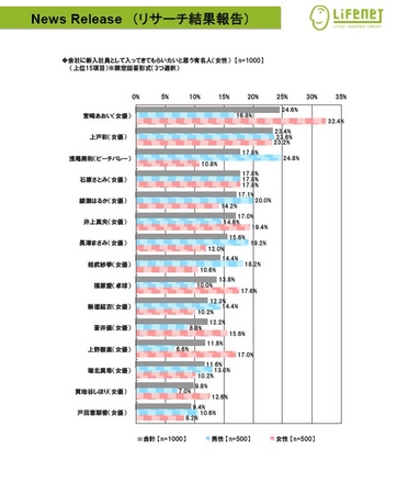 次に、女性の新入社員で総合1位となったのは、「宮崎あおい(女優)」24.6%、2位「上戸彩(女優)」23.4%、3位は同率で「浅尾美和(ビーチバレー)」17.8%、「石原さとみ(女優)」17.8%となり、5位「綾瀬はるか(女優)」17.1%という結果になりました。さらに男女別で見ると、男性有職者で1位になったのは「浅尾美和(ビーチバレー)」24.8%、2位「上戸彩(女優)」23.6%、3位「綾瀬はるか(女優)」20.0%となりました。一方、女性の有職者では、1位「宮崎あおい(女優)」32.4%、2位「上戸彩(女優)」23.2%、3位「井上真央(女優)」19.4%となり、男性が求める新入社員像と、女性が求める新入社員像に差を見ることができました。