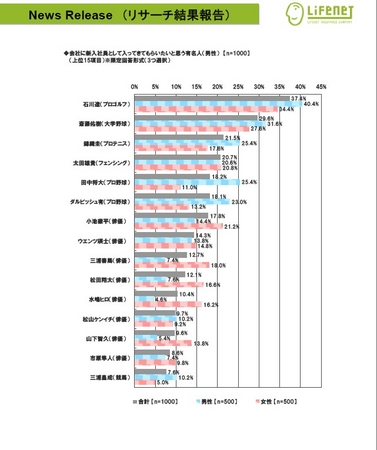 20代から50代の有職者の男女1000名(男性500名、女性500名)に対し、自分の会社に新入社員として入ってきて欲しい有名人は誰なのかを尋ねたところ(限定回答形式:3つ選択)、男性の新入社員で総合1位となったのは、「石川遼(ゴルフ)」で37.4%、2位「斎藤佑樹(大学野球)」29.6%、3位「錦織圭(テニス)」21.5%、4位「太田雄貴(フェンシング)」20.7%、5位「田中将大(プロ野球)」18.2%という結果となり、上位5人全てがスポーツ選手となりました。さらに男女別で見ると、男女とも1位、2位は変わらず1位「石川遼(プロゴルフ)」(男性:40.0%、女性:34.4%)で、2位「斎藤佑樹(大学野球)」(男性:31.6%、女性:27.6%)となりました。男性有職者の3位は同率で「錦織圭(テニス)」、「田中将大(プロ野球)」25.4%となりました。一方、女性有職者で3位となったのは「小池徹平(俳優)」21.2%となっており、3位の項目で男女の嗜好性の違いが見られました。