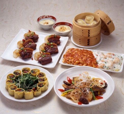 ③中華パーティー料理(薄焼き卵の五目巻き、トンポーロー、マントウ、鯛と彩り野菜の海老風味ソース、紅白あんかけ焼飯、豆腐花)