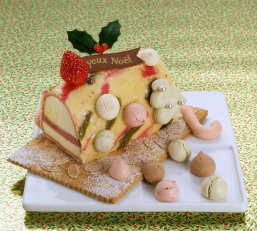 クリームチーズとさわやかなフランボワーズのムース入りのケーキに、メレンゲ菓子を飾ります。クリスマスの食卓を彩る可愛らしいケーキです。