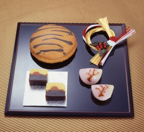 ゴマ風味の皮にとら豆、栗、こしあんの入った「虎・とら」、黄味あんと黒糖羊かんの味が絶妙な「御来光」、ういろう生地でごぼう入りあんを包み、羊かんで梅の花を描いた「変り花びら」と、おめでたい和菓子です。