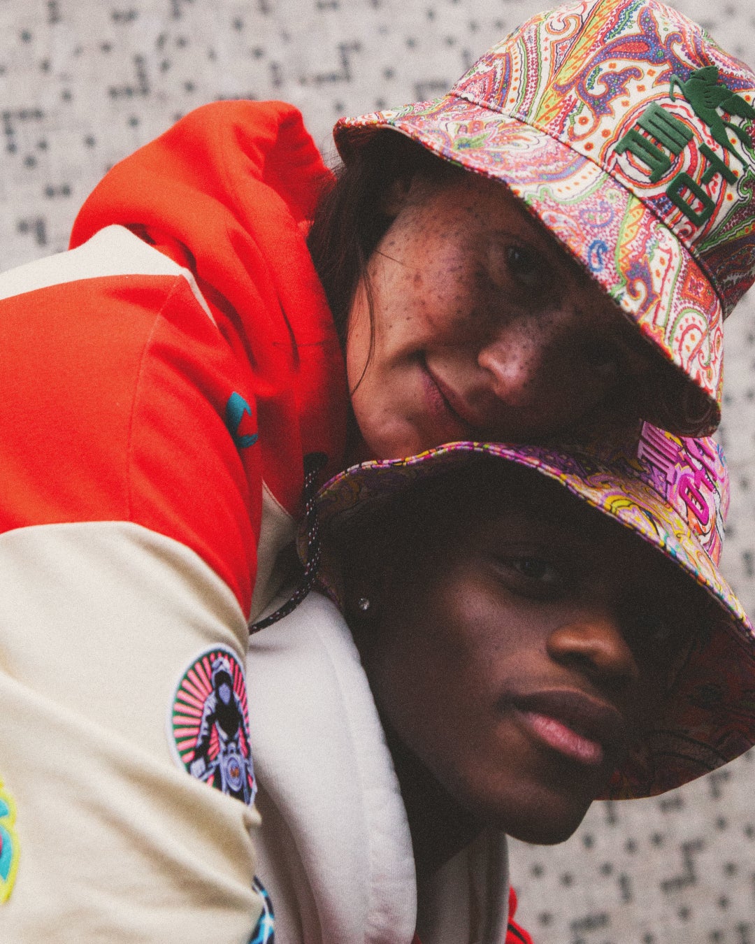 彼らが身に着ける鮮やかなペイズリー柄、カーキのソリッドカラーのバケットハットには、フロントにはブランドのニューロゴであるCUBEロゴ、バックには愛を語るメッセージがあしらわれています。