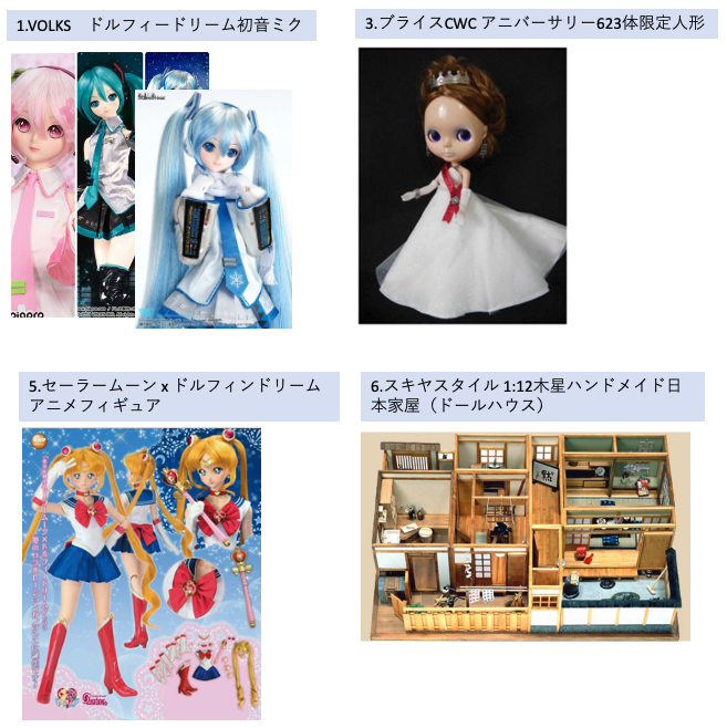 海外で人気が高いのがフィギュアと人形関連商品。日本で入手しやすく海外で購入できない商品です。海外では日本のアニメは絶大な人気があり、ケーブルテレビでは数十CH以上放映される国もあり日本以上の番組数を誇ります。「Japanese figure」や「Japan Anime figure」などのキーワードで販売され、ドラゴンボールやセーラームーンといった名作アニメから日本で放送中のアニメまで幅広く売れています。なかでも限定商品やナンバリングが入った商品は驚くほどの価格になることがあり、eBayではオークション型式で価格が決定されています。