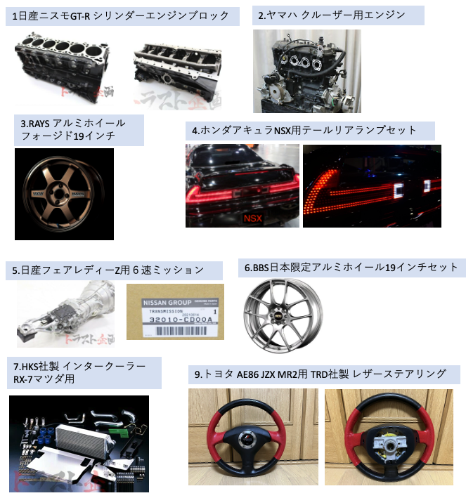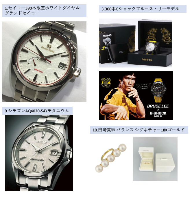 (1)新型コロナウィルスの影響により巣篭もり商品が急増。ゲーム機器とソフト、フィットネス関連商品、健康食品、楽器(ギターやキーボードだけでなく、本格的な高価な三味線なども)、職人が作るお手製の銅製の高級園芸用ジョーロ、コレクターに人気のあるフィギュア、人形(伝統工芸の木目込人形の招き猫なども)、玩具など趣味に関連する商品が増加