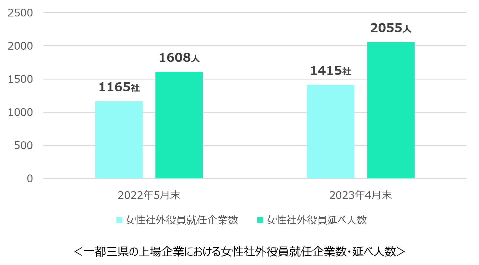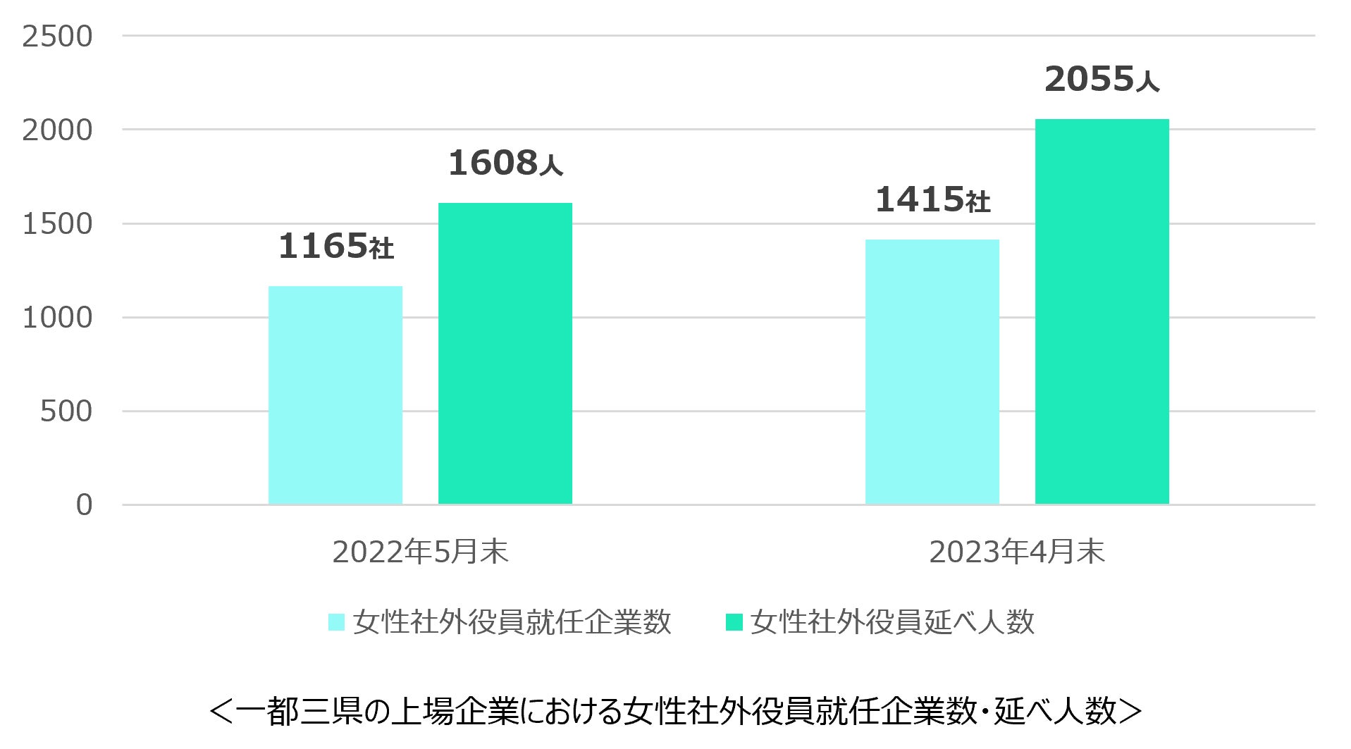 一都三県(東京都・神奈川県・埼玉県・千葉県)の上場企業における女性社外役員は2022年5月末時点(※1)は 1,608人だったのに比べ、2023年4月末時点(※2)では2,055人(※3)と447人増加、約1.3倍に伸長しています。 また、女性社外役員を採用している企業数は1165社から1415社へ250社増加しており、一都三県の上場企業の中で、女性社外役員を採用している企業の割合は48%から57%で約1割増加しました。