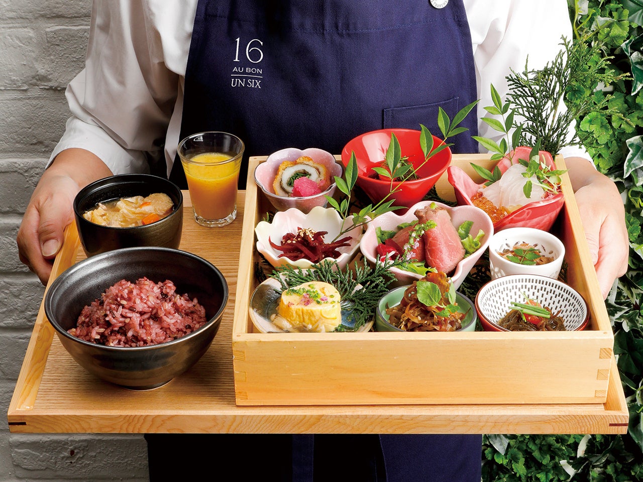 おぼん食堂16の「16」は、フランス語で1(un)と6(six)を意味する「アンシス」という読み名です。これは、「一汁六菜」の頭文字、16を示すとともに、「すばらしい人生には、おいしい食事が不可欠。忙しい毎日でも、食事を自分らしく楽しもう。」という、フランス流のメッセージも込めました。