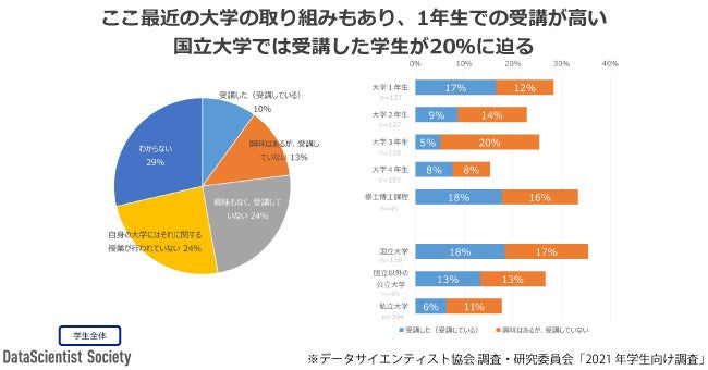 - 近年の大学カリキュラム変更の影響もあり、大学1年生でデータサイエンス関連の授業の受講割合が高い