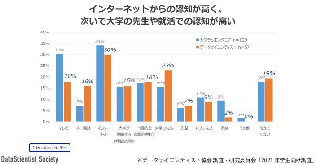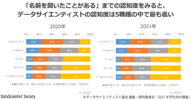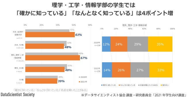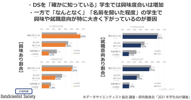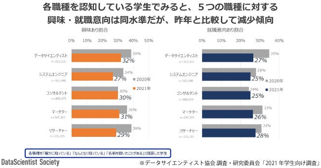 データサイエンティストの認知度は30%で昨年と同水準、認知者の6割以上が就職検討の対象に。DS関連授業は1年生が多数受講