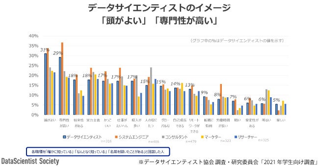 データサイエンティスト協会 調査・研究委員会(委員長 塩崎潤一)では、「データサイエンティスト市場の"需要と供給のミスマッチ"の解消」をメインテーマに調査・研究活動を行っています。これから就職を考える学生がDSに対してどのような印象を持っているかを調査しました。調査は所属学部に関係なく、一般の学生を対象に行い、システムエンジニアやコンサルタントなどの職種と比較してDSの実態を明らかにしています。