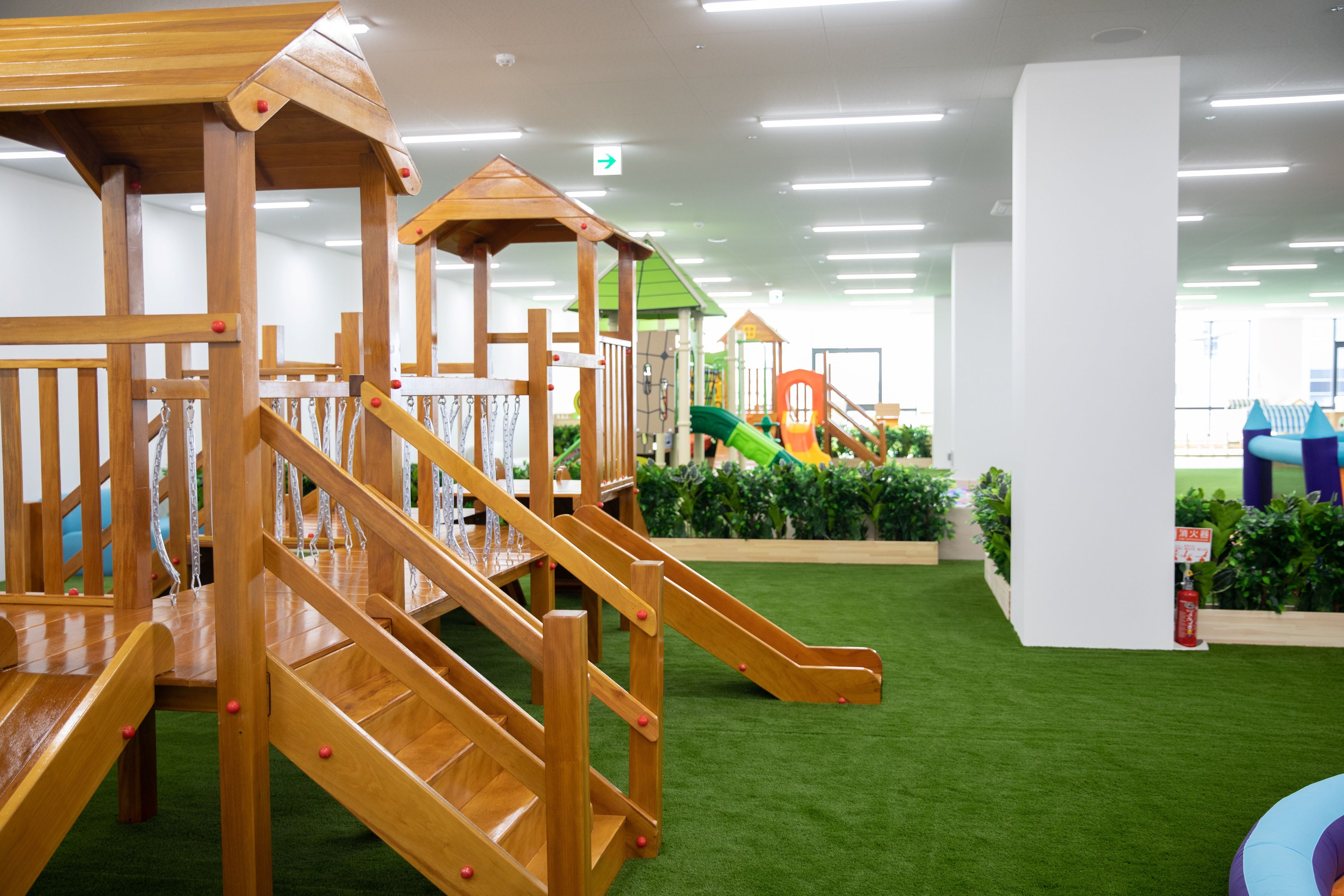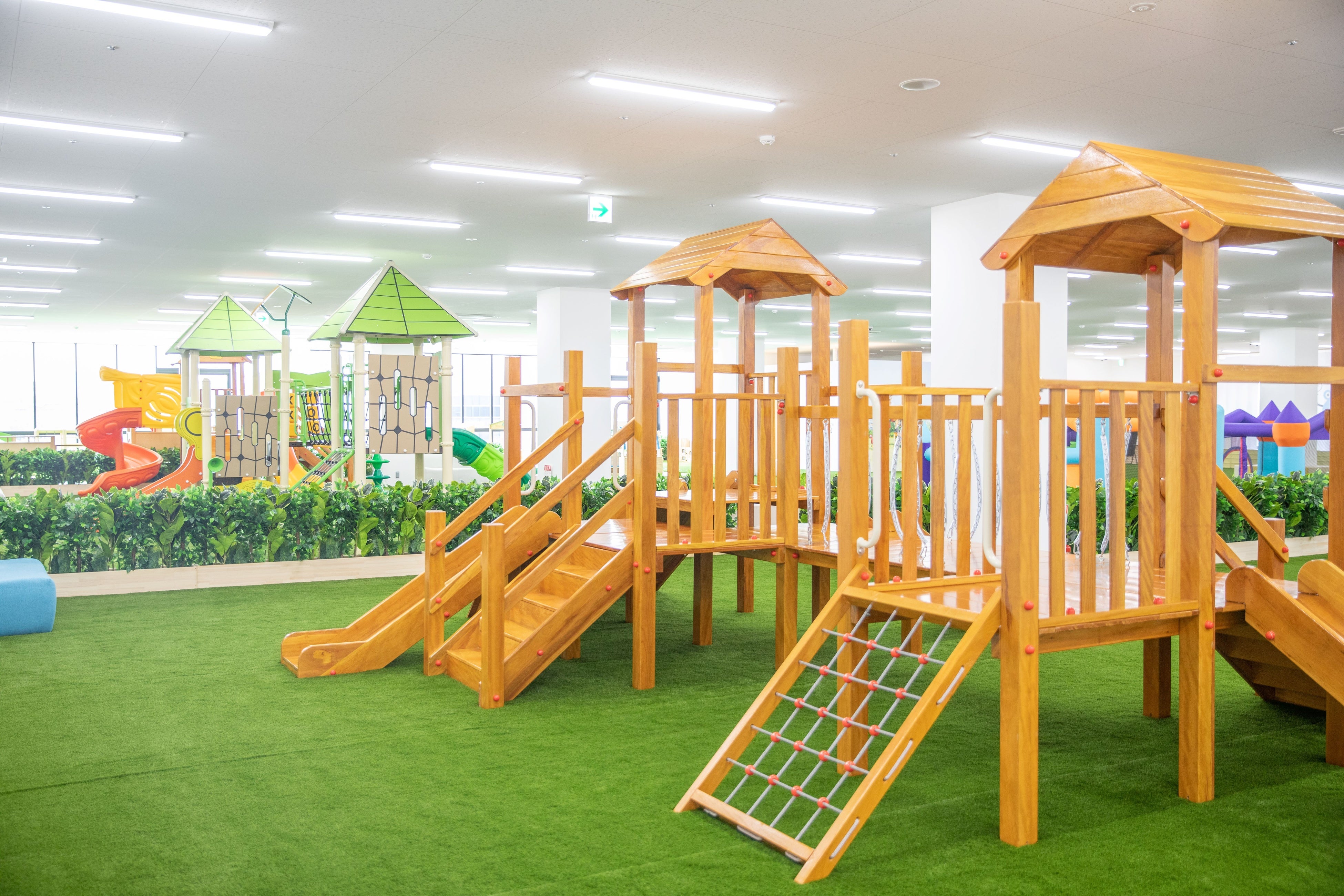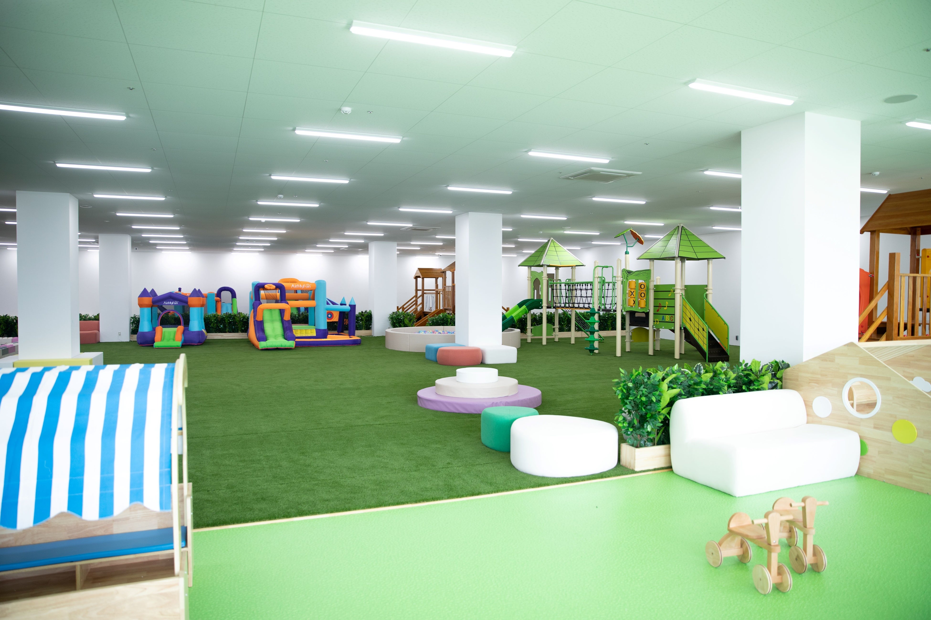 右されず、こどもたちが思いきりあそべる全⾯⼈⼯芝の屋内遊具公園です。
