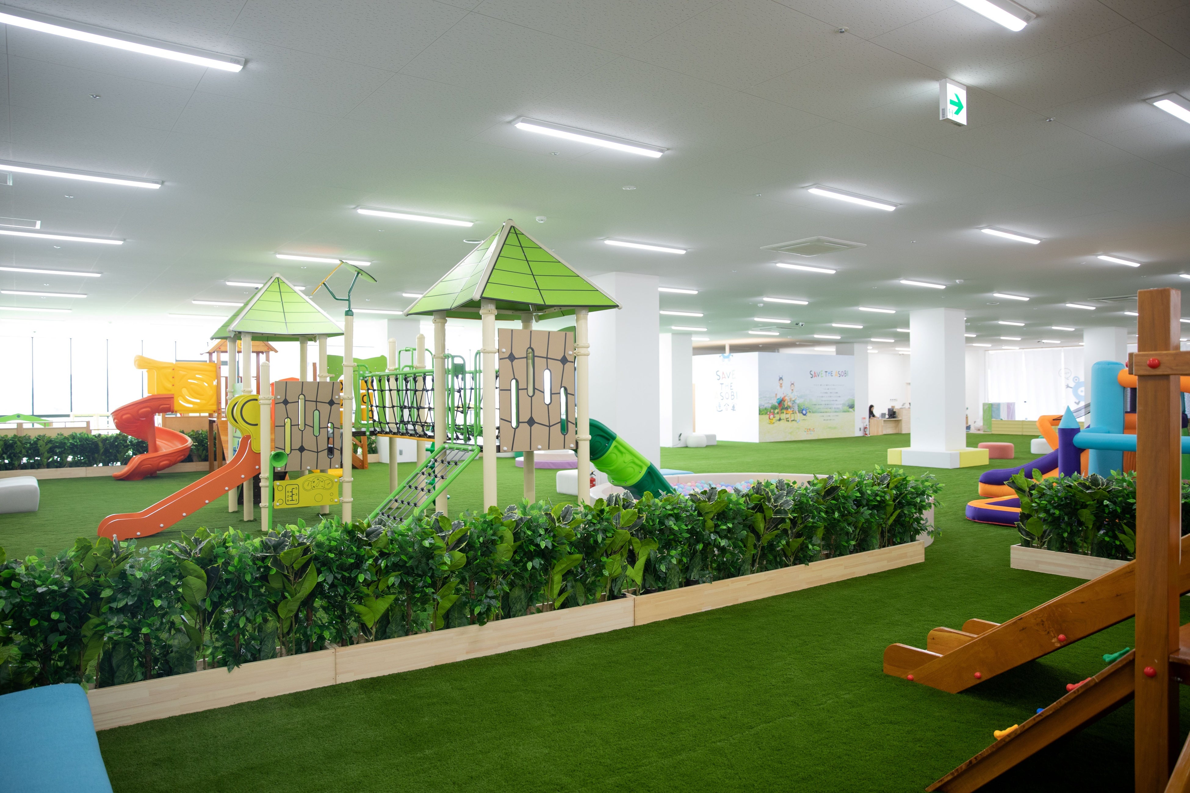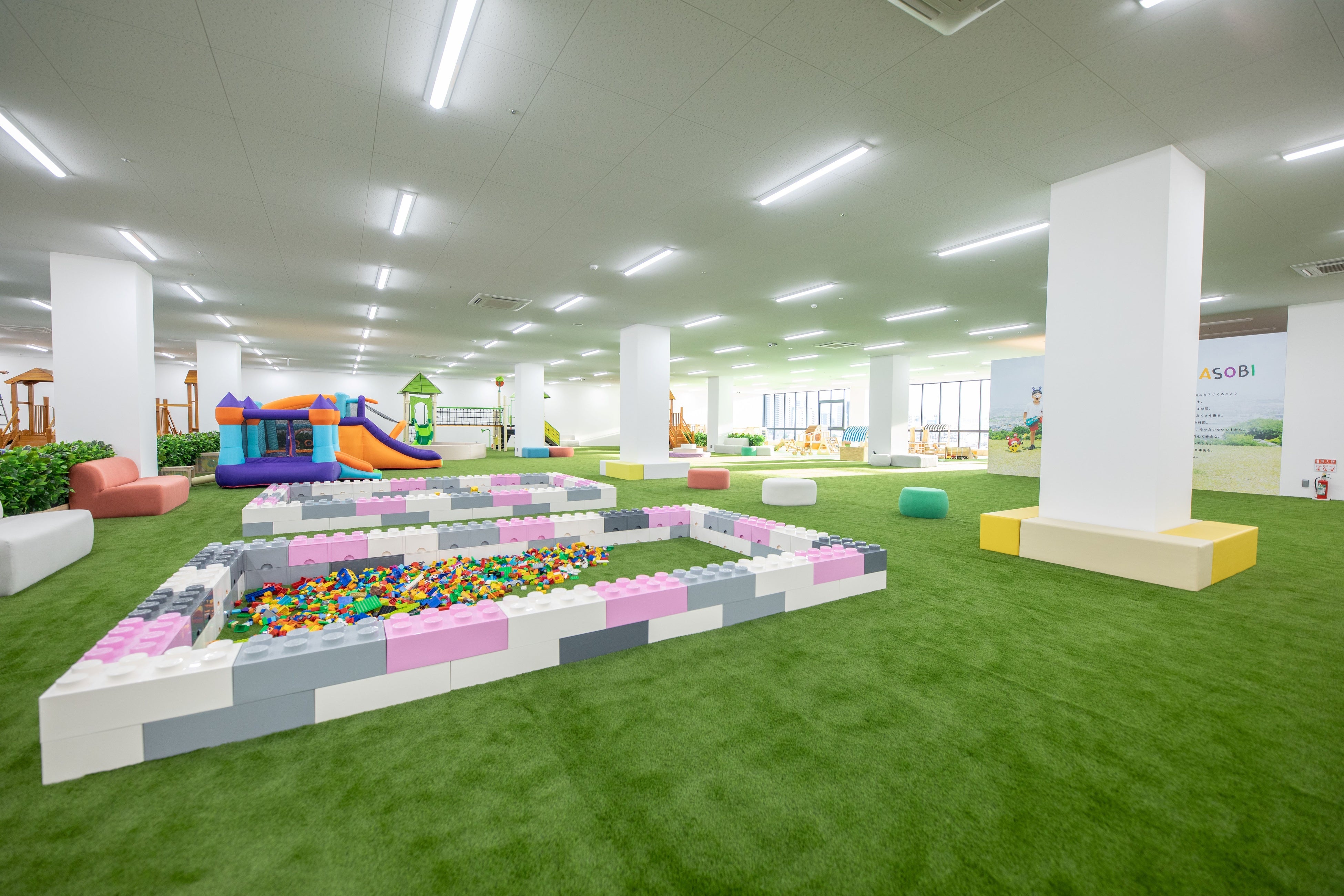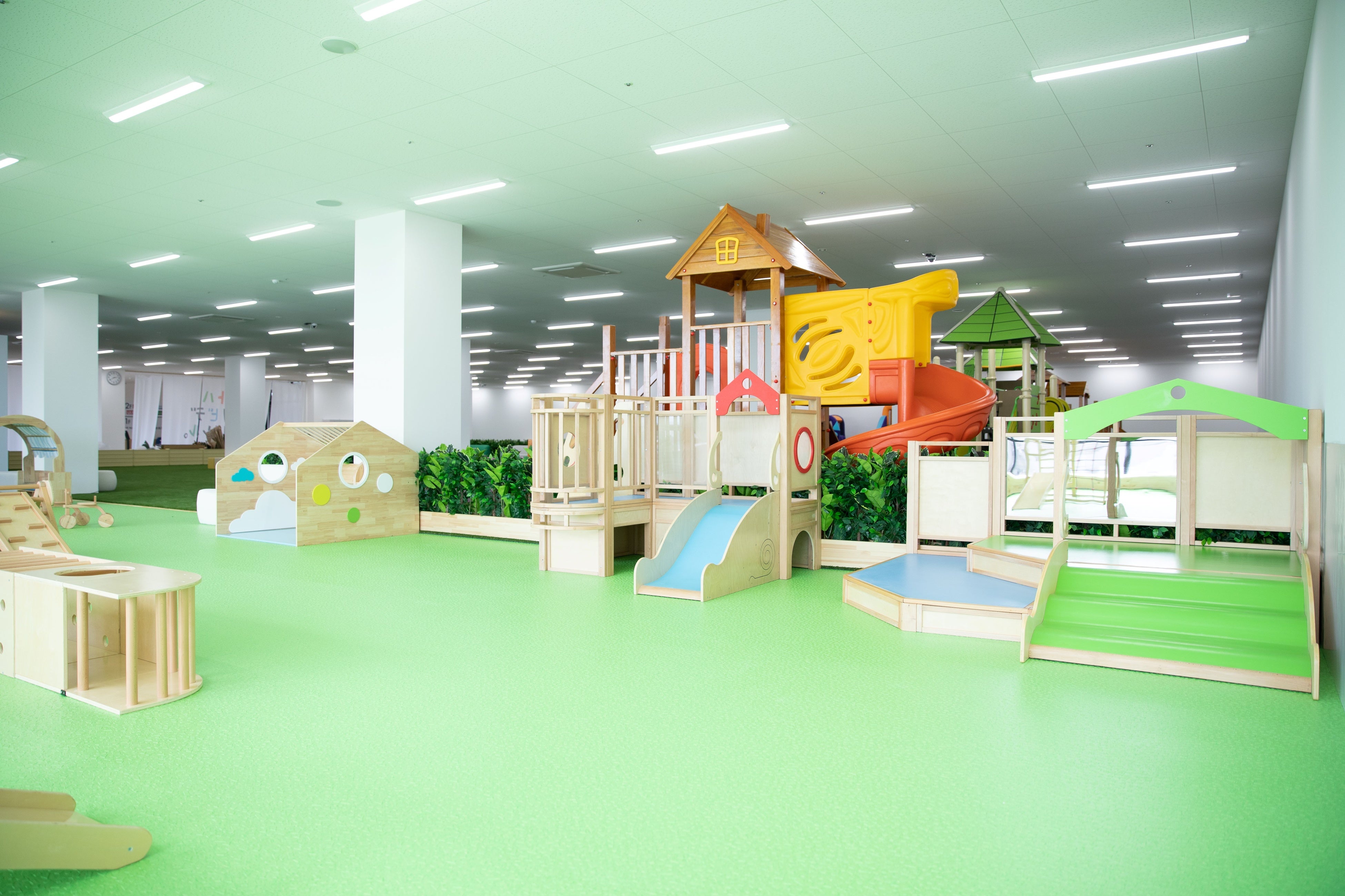 右されず、こどもたちが思いきりあそべる全⾯⼈⼯芝の屋内遊具公園です。