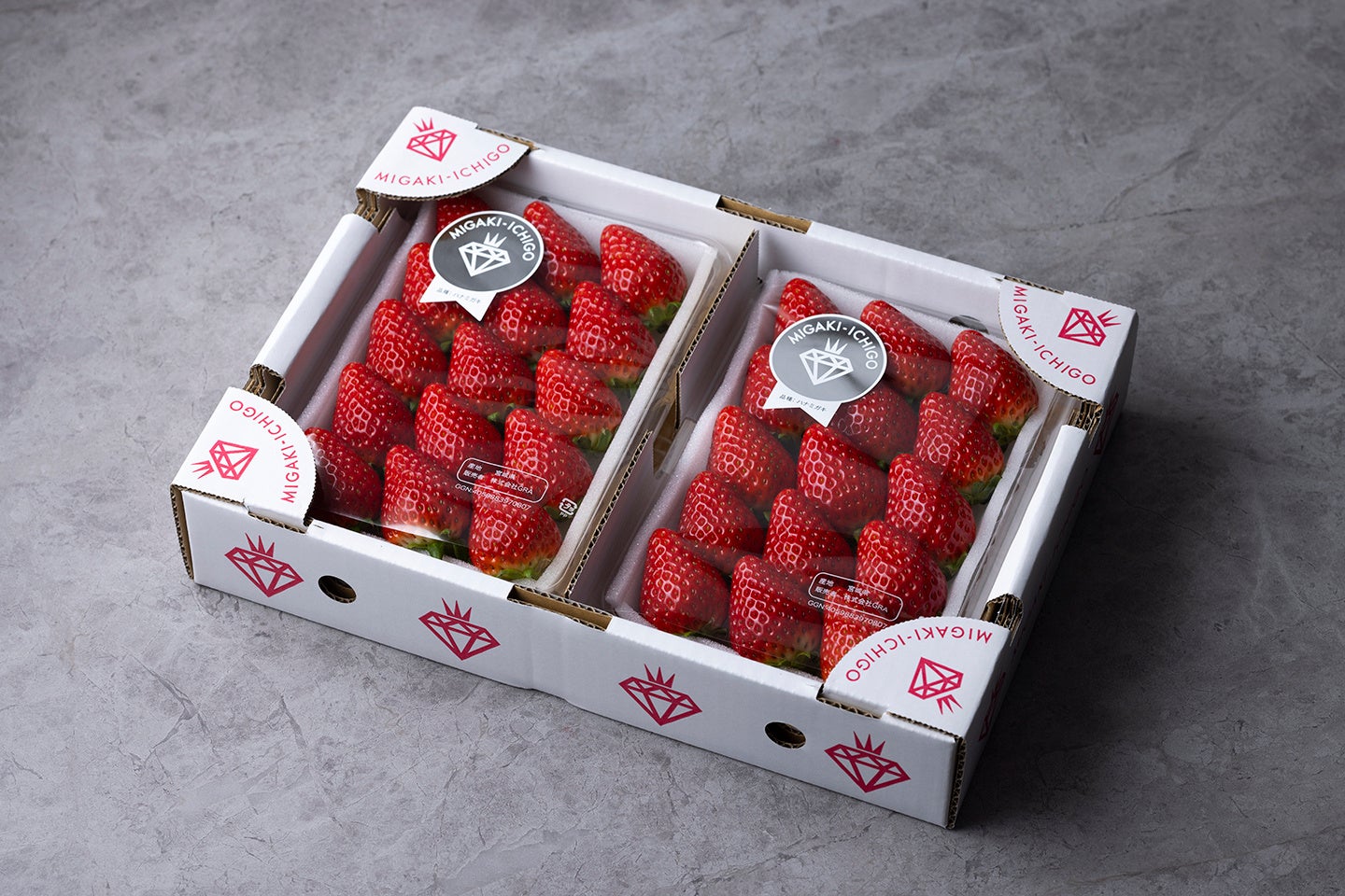 もっとも美味しいタイミングで召し上がっていただくため、完熟ギリギリで収穫、熟度、果形、糖度など、厳格に定めた基準をクリアしたイチゴだけが「ミガキイチゴ」として出荷されます。プラチナ、ゴールド、シルバー、レギュラーのランク付けがあります。