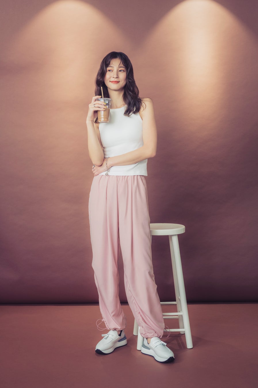 Y2Kファッションや、クロップド丈のトップスに合わせたい、ルーズシルエット。落ち感のある軽量薄手素材を使用し、裾は調整可能なドローコード付き。まったりとおうちでも、ゆるく動きやすい格好で出かけたい日でも、幅広く使えます。