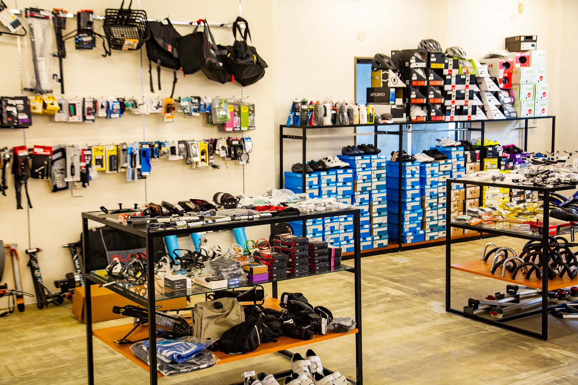 100台以上が展示可能な広々とした店内には、ロードバイクやマウンテンバイク、クロスバイクといったスポーツ自転車をはじめ、電動アシスト自転車やキッズバイクと様々なシーンでご利用いただける車体をラインナップ致しました。自転車本体以外もヘルメットやシューズ、アイウェアなどのアパレル用品や便利なアクセサリー、工具類などバラエティ豊富な品揃えとなっております。