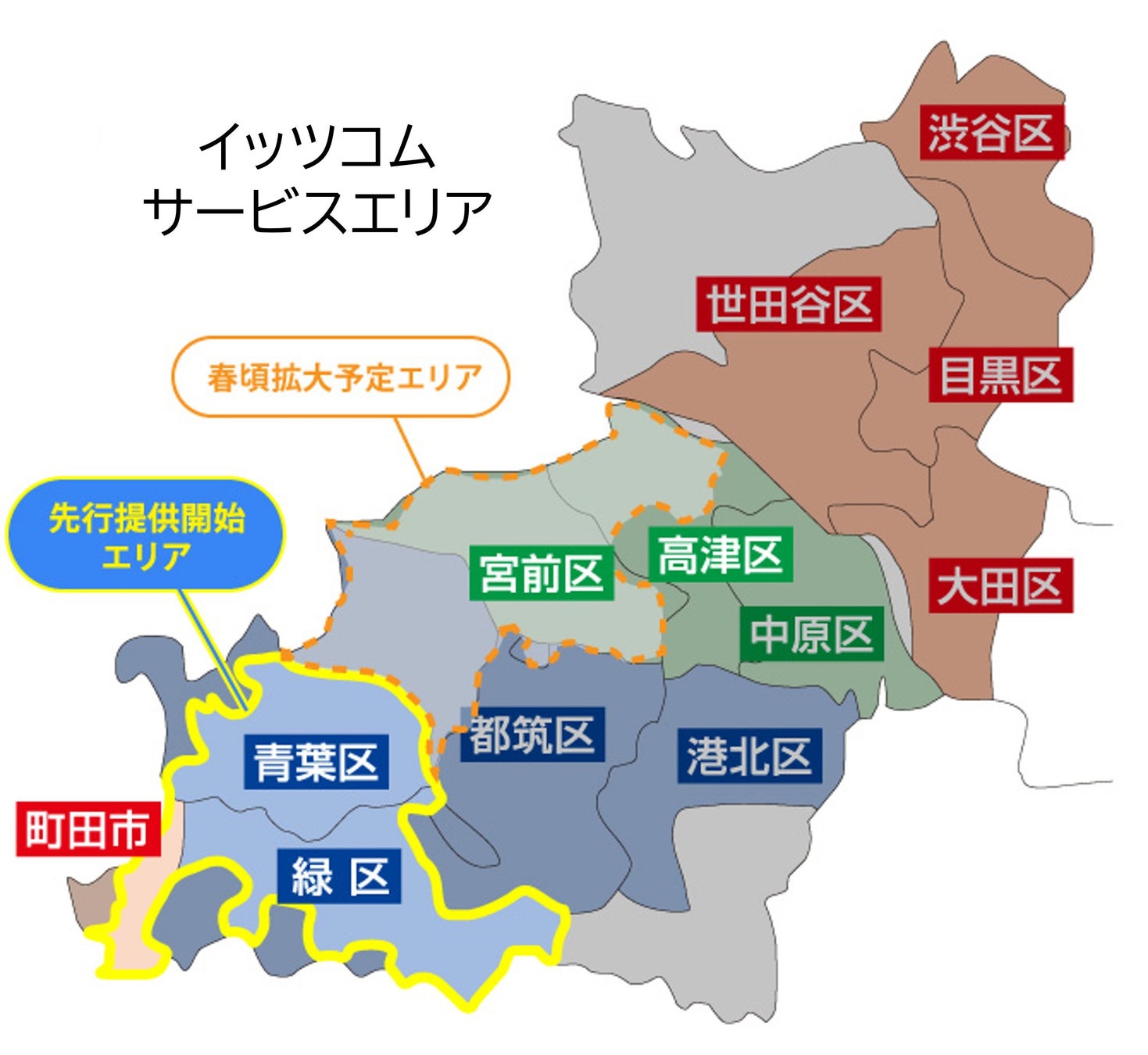 横浜市青葉区のイッツコムサービスエリア全域と横浜市都筑区および川崎市宮前区・高津区のイッツコムサービスエリアの一部