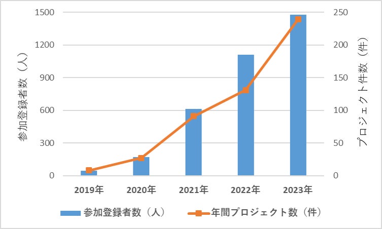 「GRANT」の参加登録者数は、2019年度に運用開始して以来、増加を続けており、2023年3月末時点では1477人となりました。年間のプロジェクト実施件数も毎年増加し、2023年度の1年間では、「プロジェクト」「オンライン相談」あわせて239件、そして「イベント」62件が実施されました。