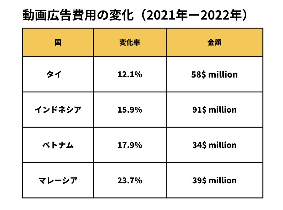 東南アジア各国では、動画広告における広告費全体が拡大しています。