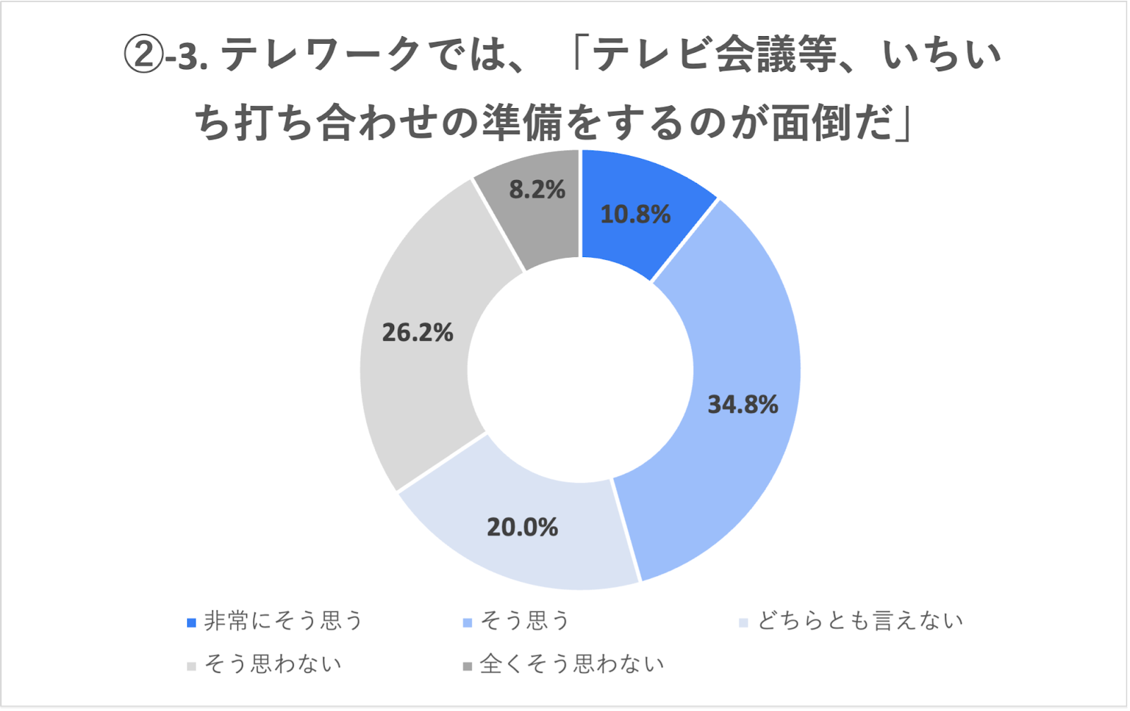 - 会議中、聞き取りづらい場面があって不便。コロナ禍が収まった後は、テレビ会議の通信の品質が向上しない限り、テレワークの実施は少なくなりそう。(20代男性)