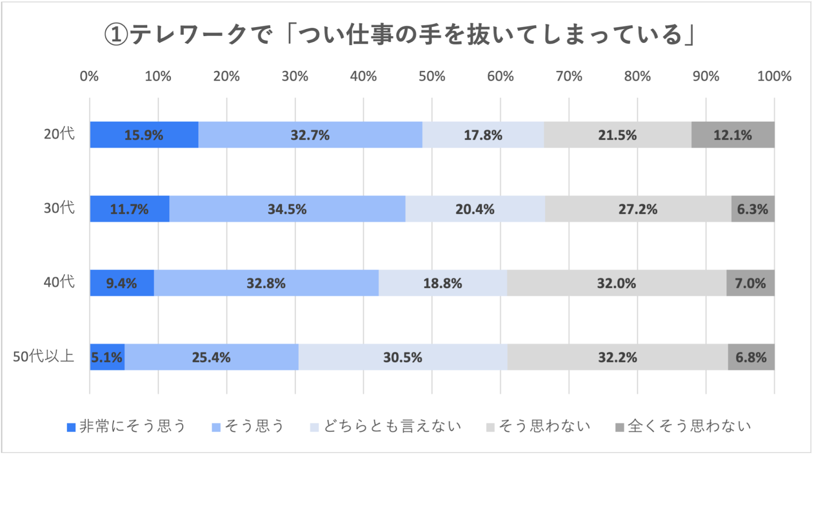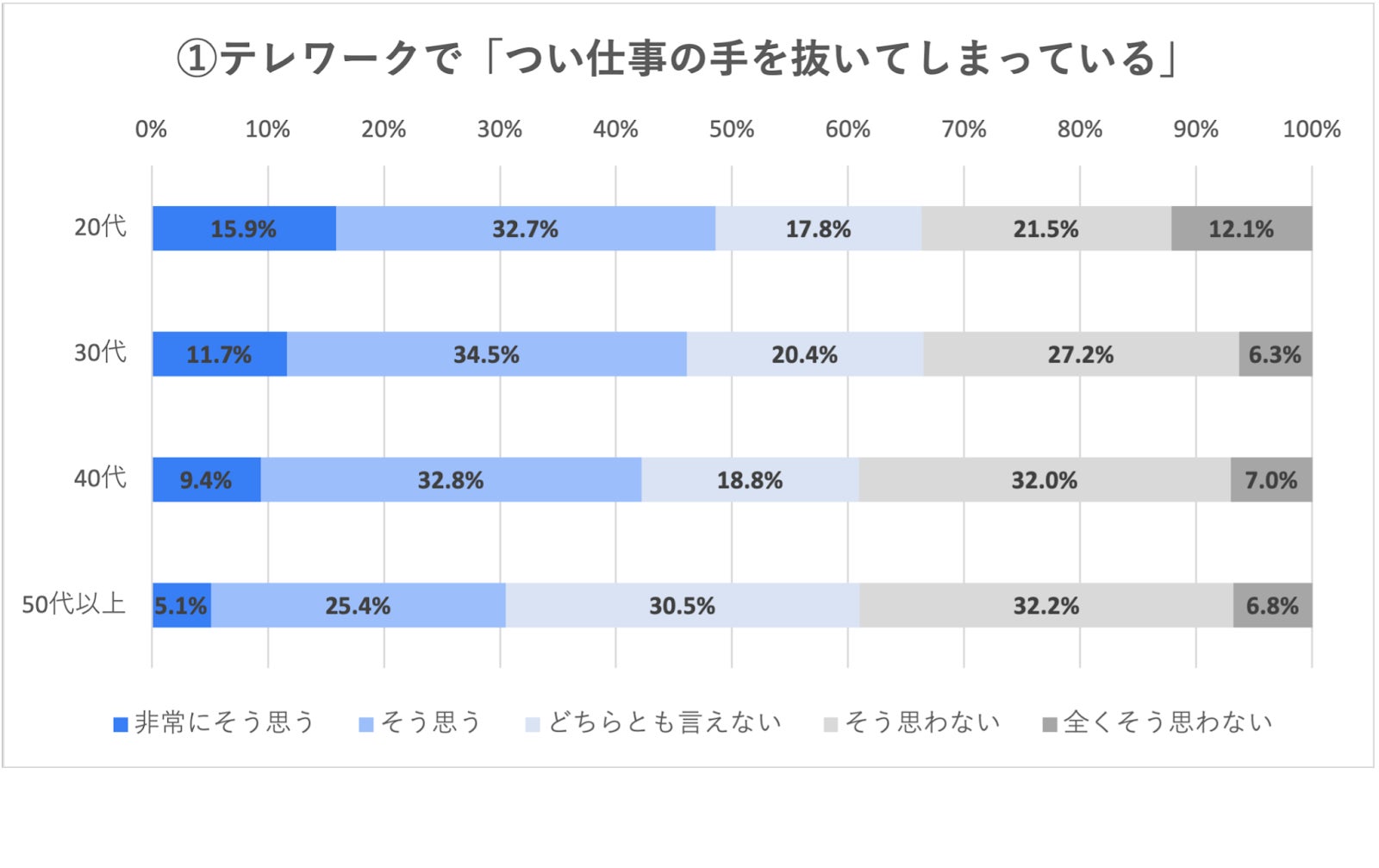 50代以上でも30.5%が、20代では48.6%が、テレワーク中に「つい仕事の手を抜いてしまう」と回答しました。