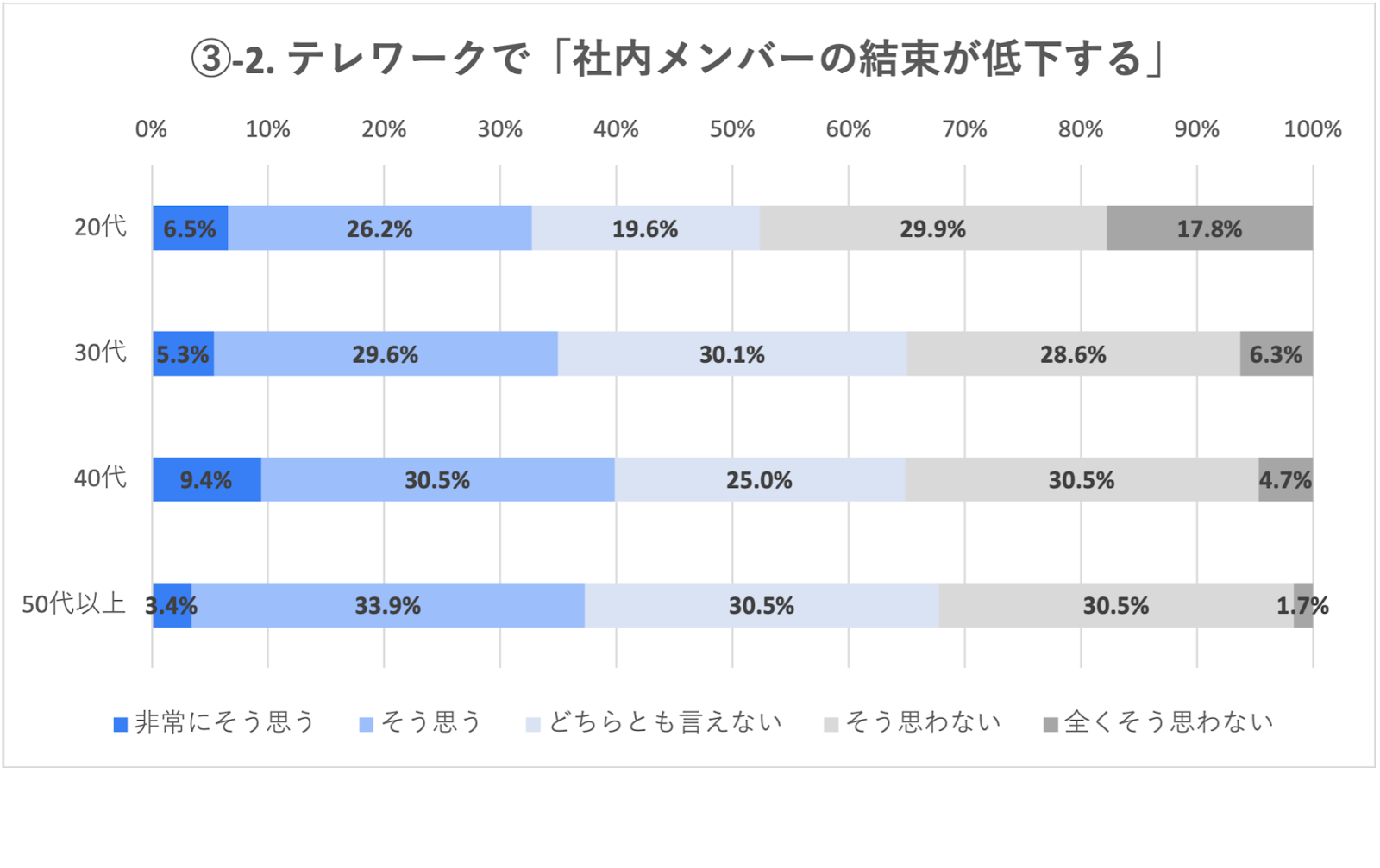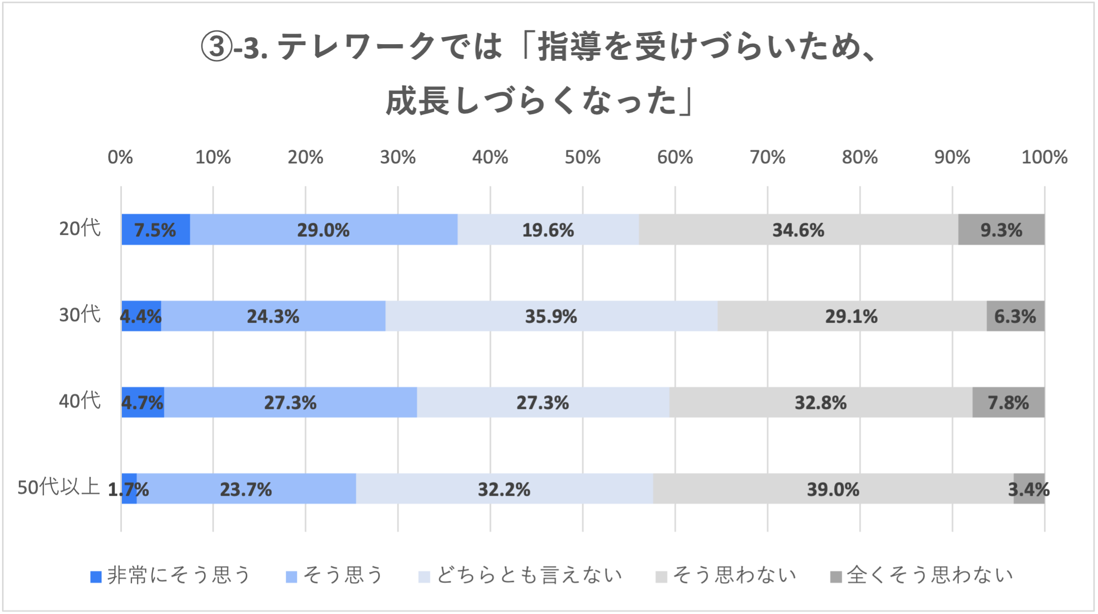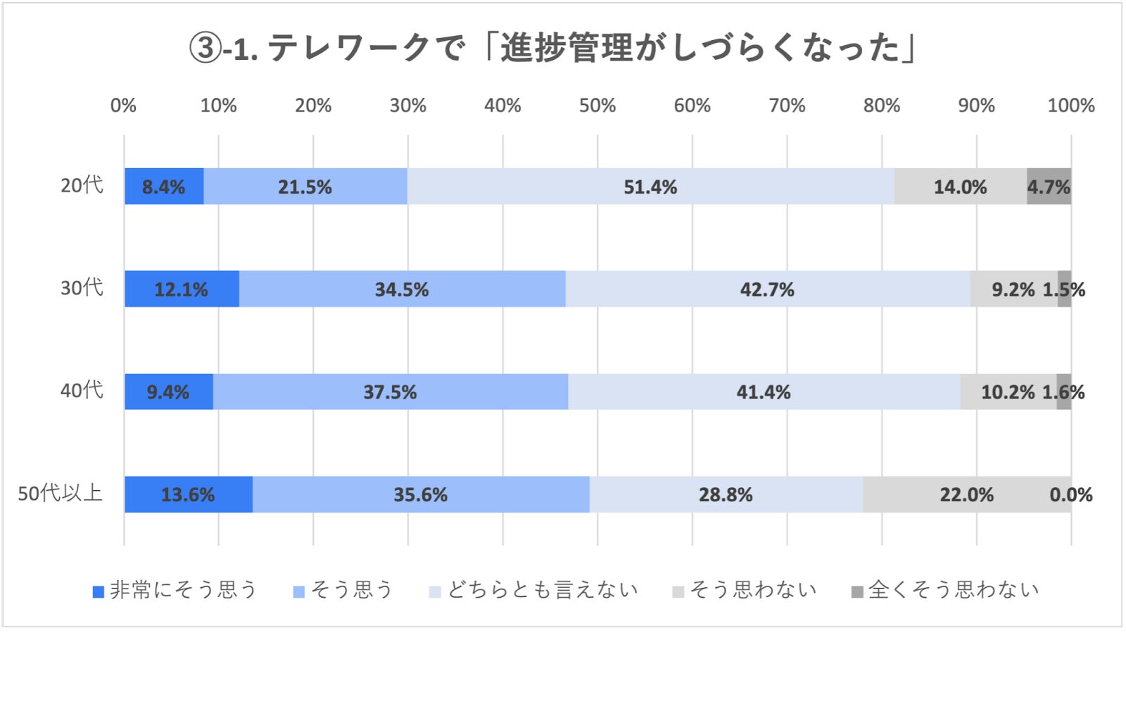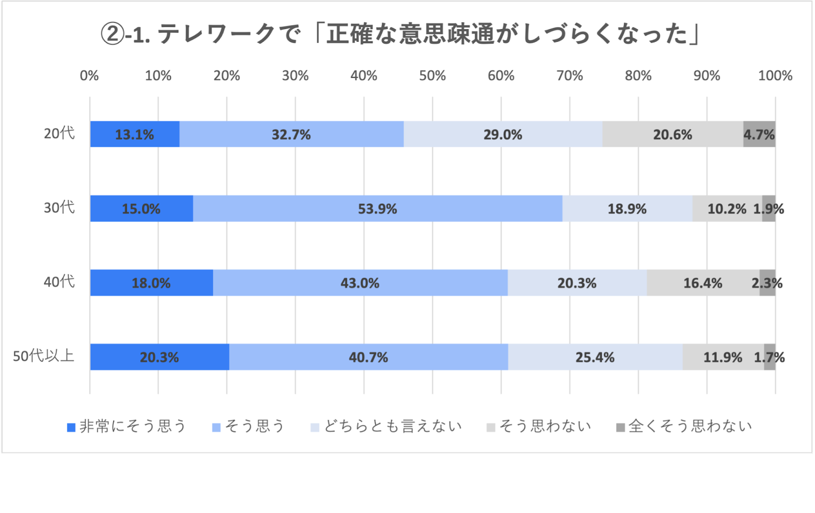 20代でも45.8%が、30代では68.9%に上る人々が、テレワークでの意思疎通に難しさを感じています。