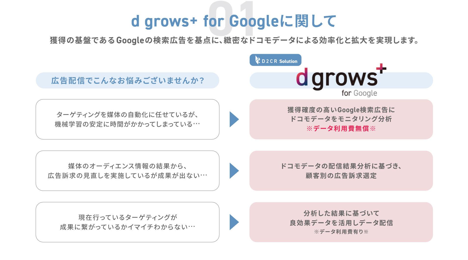株式会社D2C R(本社:東京都港区、代表取締役社長:豊永 雅史、以下「D2C R」)は、株式会社NTTドコモ(以下、ドコモ)が保有する約9,600万人(※1)の会員基盤をベースとするドコモデータを活用した広告ソリューション「d grows+」の提供を開始いたしました。また「d grows+」シリーズの第一弾として、「d grows+ for Google」「d grows+ for Creative」の2つのソリューションをリリースしましたのでお知らせいたします。