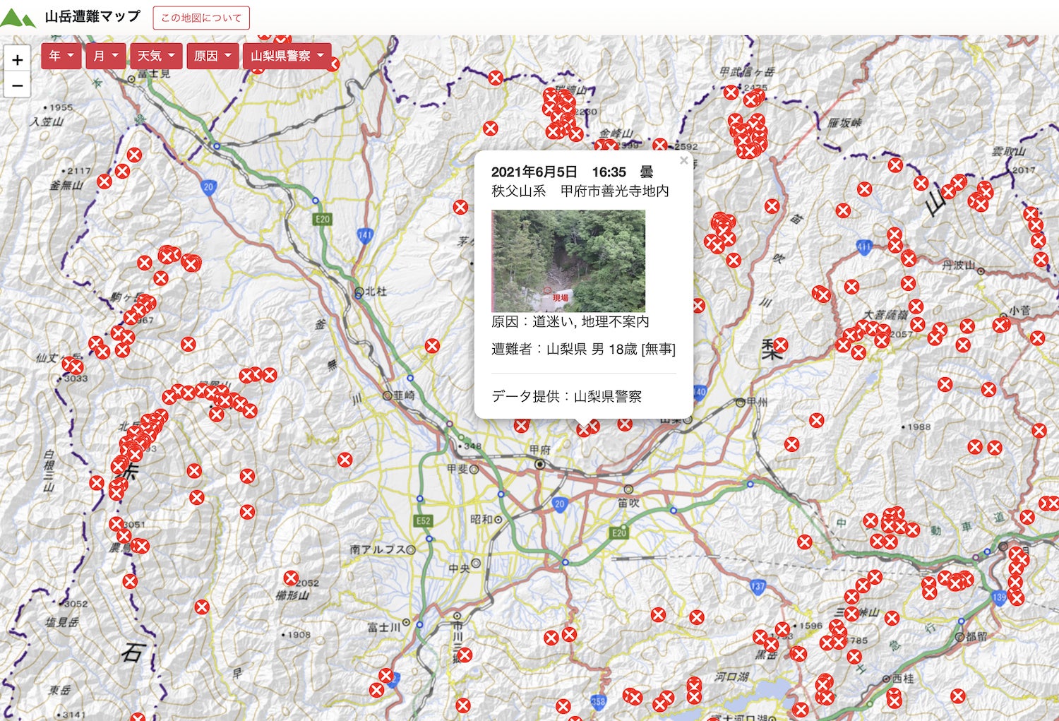 山岳遭難マップとは発生した山岳遭難の位置情報を地図に掲載して、計画時や登山中に確認できる地図です。