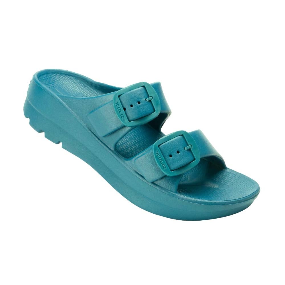 TELICの中でもデザイン性と機能性を両立した人気モデルW-BUCKLEより、写真のTEAL BLUE、CHOCOLATE、DOLPHIN GREYの新カラーが追加されます。素足に優しくフィットし、足底にかかる負担を軽減します。緩やかに弧を描くヒールが足のアーチを包み込む優れたホールド効果もTELICの特徴です。フィット感は甲の高さに合わせて調節可能、トレンド感ある厚底タイプ。ファッションとリカバリーを同時に体感して頂けるアイテムです。