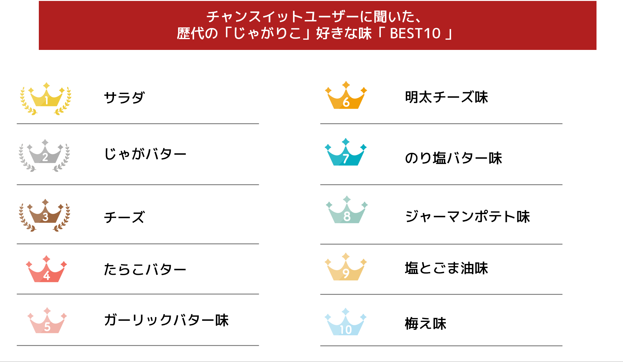 定番フレーバーは1位~4位を見事に獲得。定番フレーバー以外の味では「ガーリックバター味」「明太チーズ味」「のり塩バター味」「ジャーマンポテト味」「塩とごま油味」「梅え味」が上位10位にランクインしました。