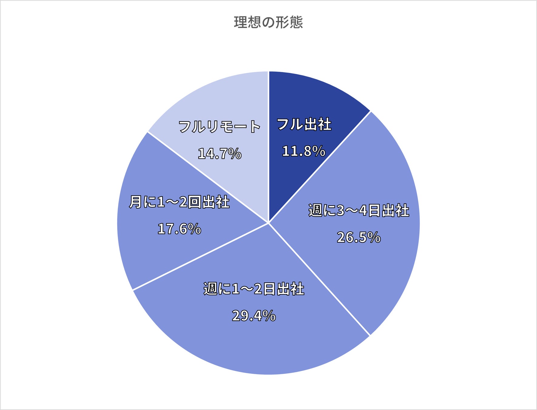 現状と理想の一番大きい違いは、現状では4分の1が選択していた「フルリモート」が14.7%と大幅減になったことです。その結果、平均出社日数は週2.1日と、理想の方が微増しました。