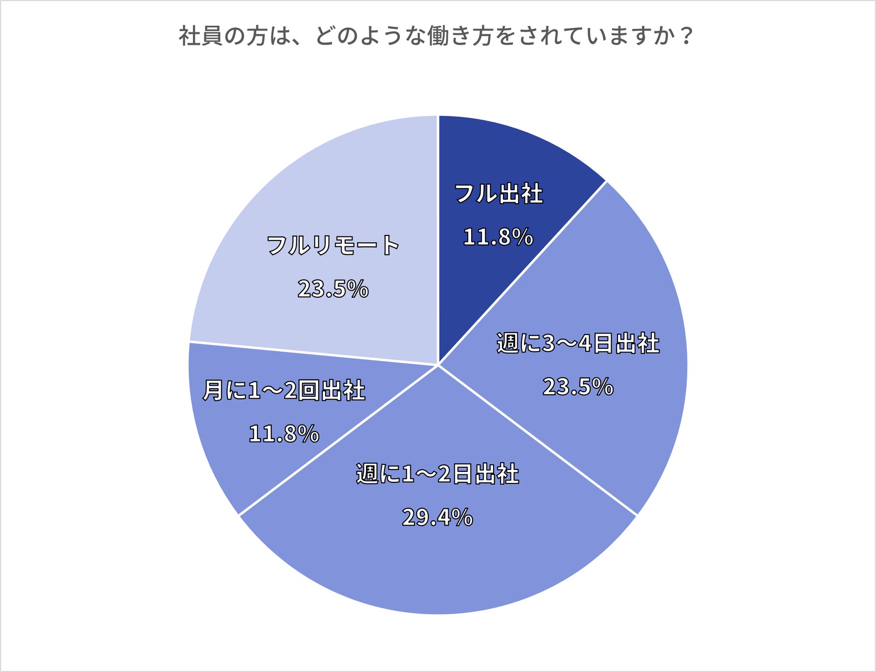 次いで、フルリモートと回答した企業が23.5%と全体の4分の1程、フル出社と回答したのは11.8%となりました。