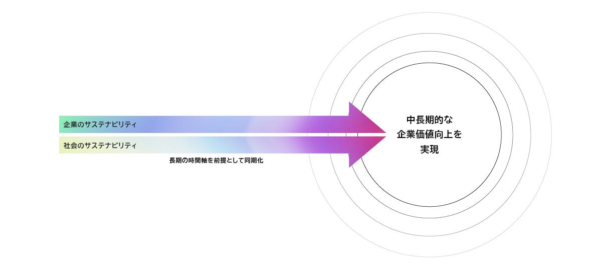 長期の時間軸を前提として企業のサステナビリティ(稼ぐ力)と環境・社会・経済のサステナビリティ(社会課題、将来マーケット)を同期化することで、企業は中長期的な企業価値向上を実現し、長期にわたり安定的に発展することができます。また、ステークホルダーからの評価が向上し、ESG投資家からの投資拡大や企業イメージ向上による消費者・取引先などの顧客の獲得につながります。