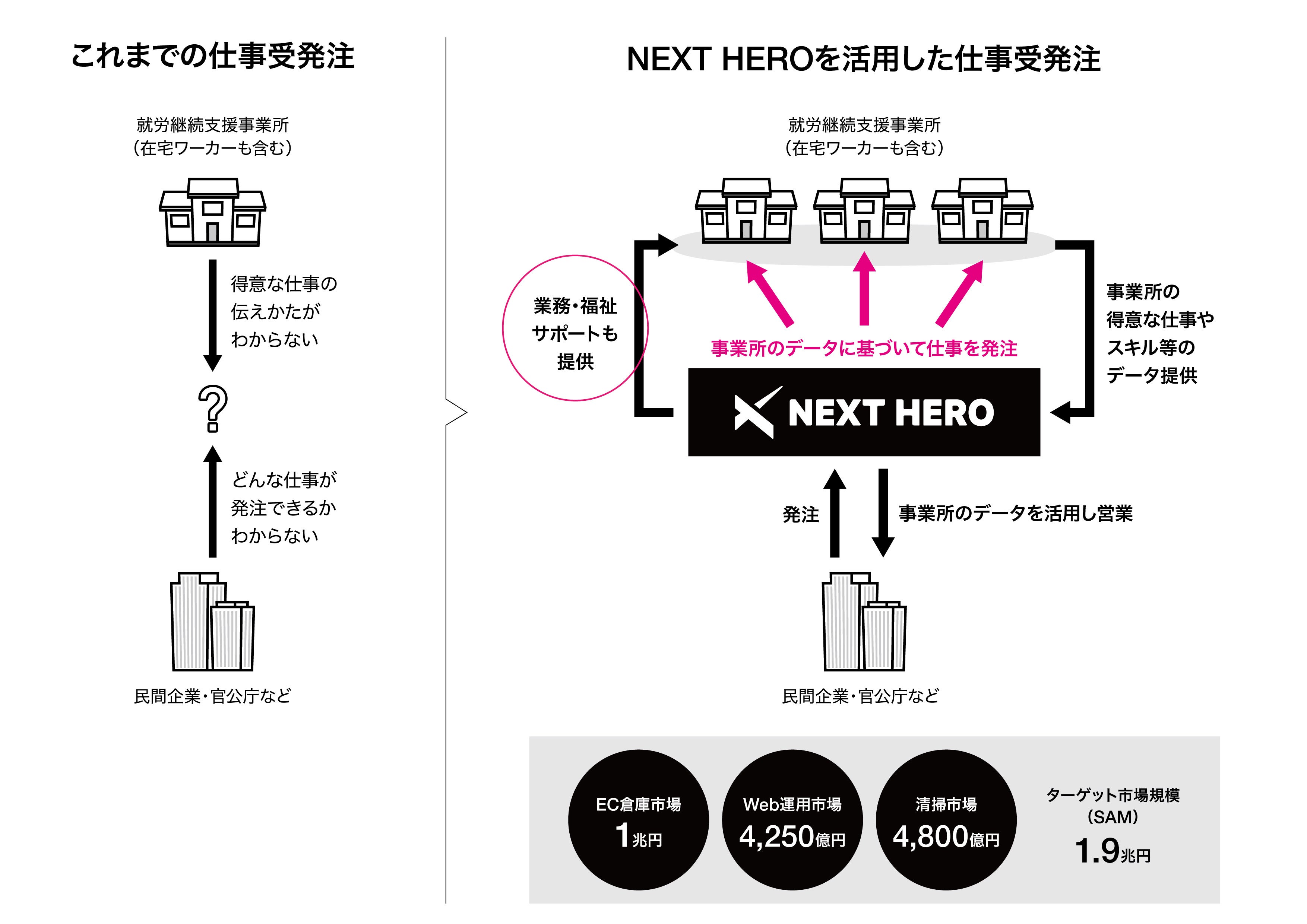事業内容:障がい者等の就労困難者特化型仕事受発注プラットフォーム「NEXT HERO」、EC・D2C特化型自社専用カスタマイズロジセンター「EC HERO」、官民連携事業、障害者雇用支援事業
