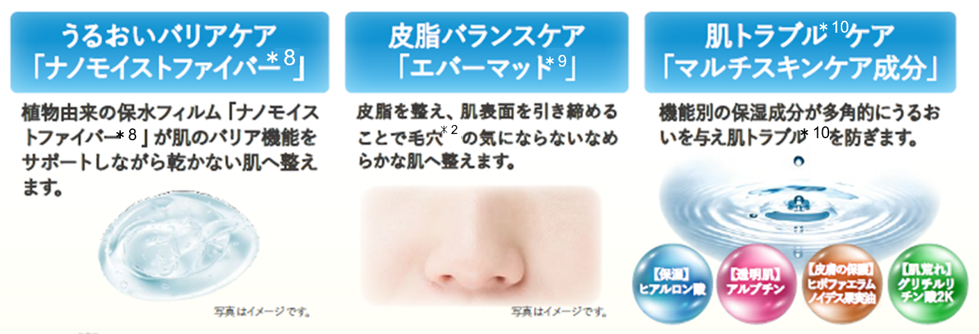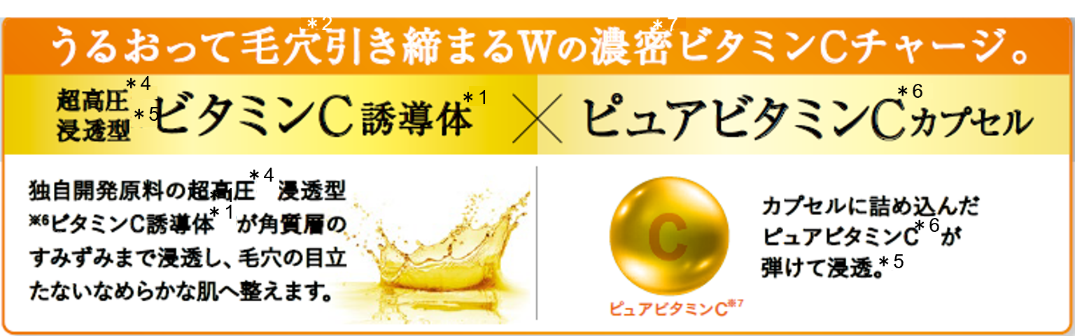 *1超高圧処理したテトラヘキシルデカン酸アスコルビル(保湿成分) *2乾燥によって開いた毛穴 *3乾燥によってキメが乱れた肌 *4超高圧加工処理装置を用いた原料 *5角質層まで *6アスコルビン酸(保湿成分) *7ジェルとカプセルがWで配合 *8セルロースガム *9エナンチアクロランタ樹皮エキス(保湿成分) *10乾燥や肌あれを防ぐこと *11肌のキメを整えファンデーションがのりやすい状態にすること