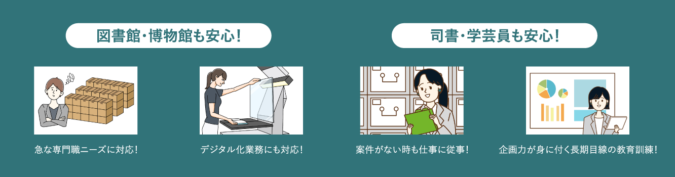 司書・学芸員資格を持つ人材に特化した派遣事業は珍しく、そのうち常用型で直接雇用者を派遣するサービスは初の取り組みです。(2024年2月 株式会社誠勝調べ)。