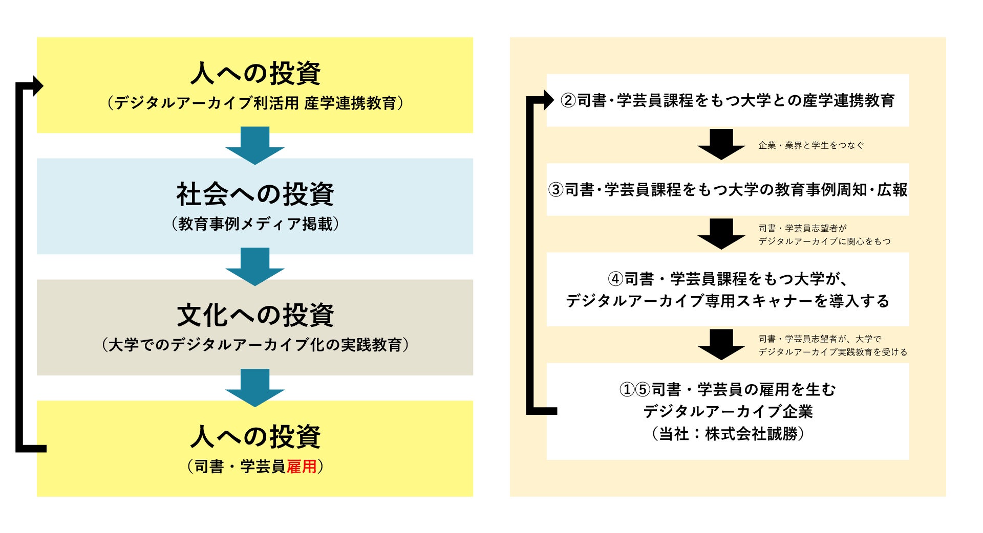 当日の発表では、デジタルアーカイブ事業を営む企業が司書・学芸員雇用を宣言することを起点に、産学連携教育実施による司書・学芸員志望学生との接点構築、大学所蔵史料を活用した史料デジタル化実践教育を通じて、司書・学芸員雇用へ繋がる旨を説明し、今後取り組むべき事業とそのマイルストーンの発表を行いました。