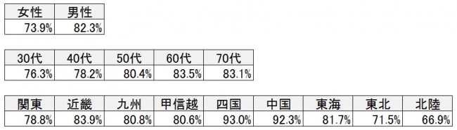 “室内墓に入りたくない”と回答した割合を属性で比較すると、男女では、女性(73.9%)の方が男性(82.3%)に比べ室内墓に肯定的な回答が若干強く、年代別では、若年層になるに従って肯定的な回答が多くなる傾向が見られました。また、地域別では、東北(71.5%)・北陸(66.9%)が比較的室内墓に肯定的な意見が若干強い傾向にあることが分かりました。