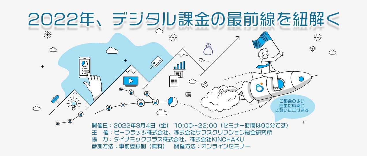 ビープラッツ株式会社(本社:東京都千代田区、代表取締役社長:藤田 健治)と株式会社サブスクリプション総合研究所(本社:東京都千代田区、代表取締役社長:宮崎 琢磨)は、2022年3月4日(金)に、いま話題の【デジタル課金】をテーマにしたオンデマンド型オンラインセミナー「2022年、デジタル課金の最前線を紐解く」を開催いたします。