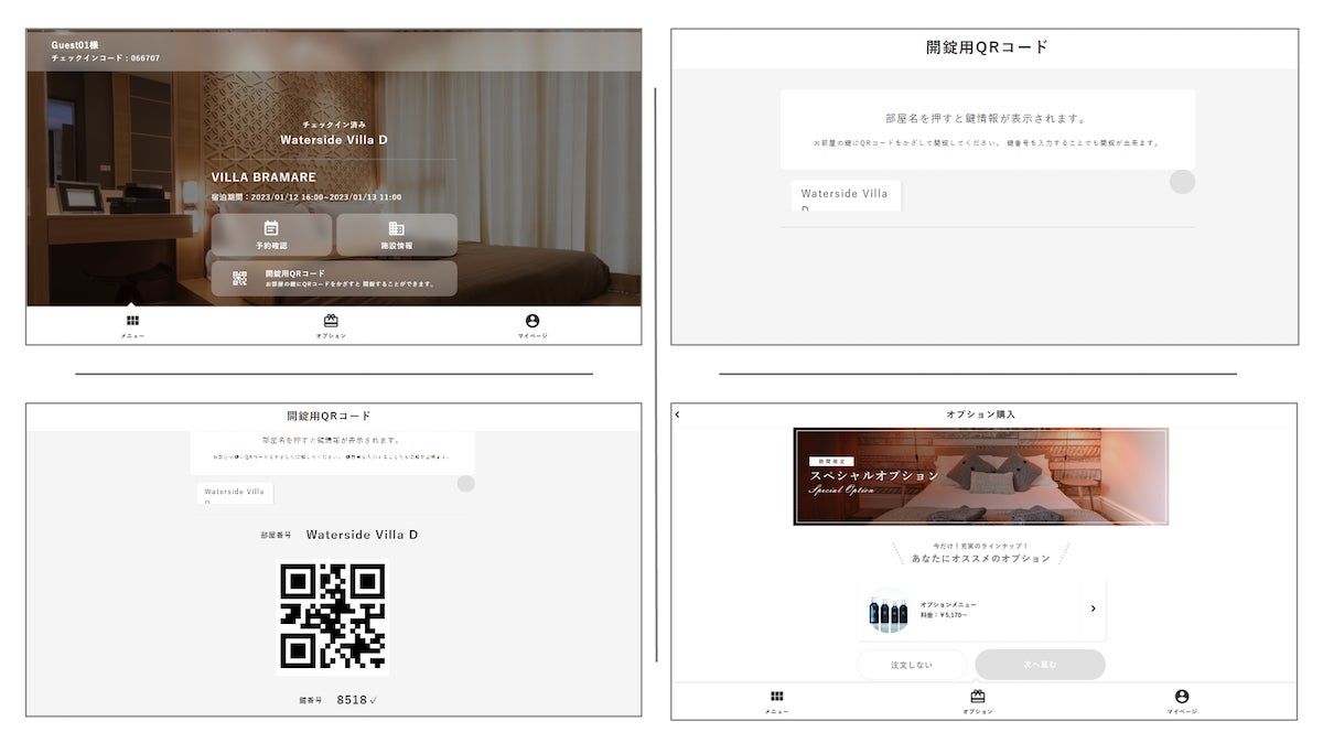 HOTELSMARTとRemoteLOCK 8j-Qの連携により、ゲストは宿泊予約日にVILLA BRAMAREのレセプション棟にてタブレットでスムーズにチェックイン。予約した棟の鍵(QRコード/暗証番号)はチェックイン完了後、人手を介すことなくメールで自動送付され、スマートに解錠・入室できます。マイページでは、鍵の確認・表示に加えて、オリジナルアメニティ類の購入やルームサービスのご注文なども可能です。