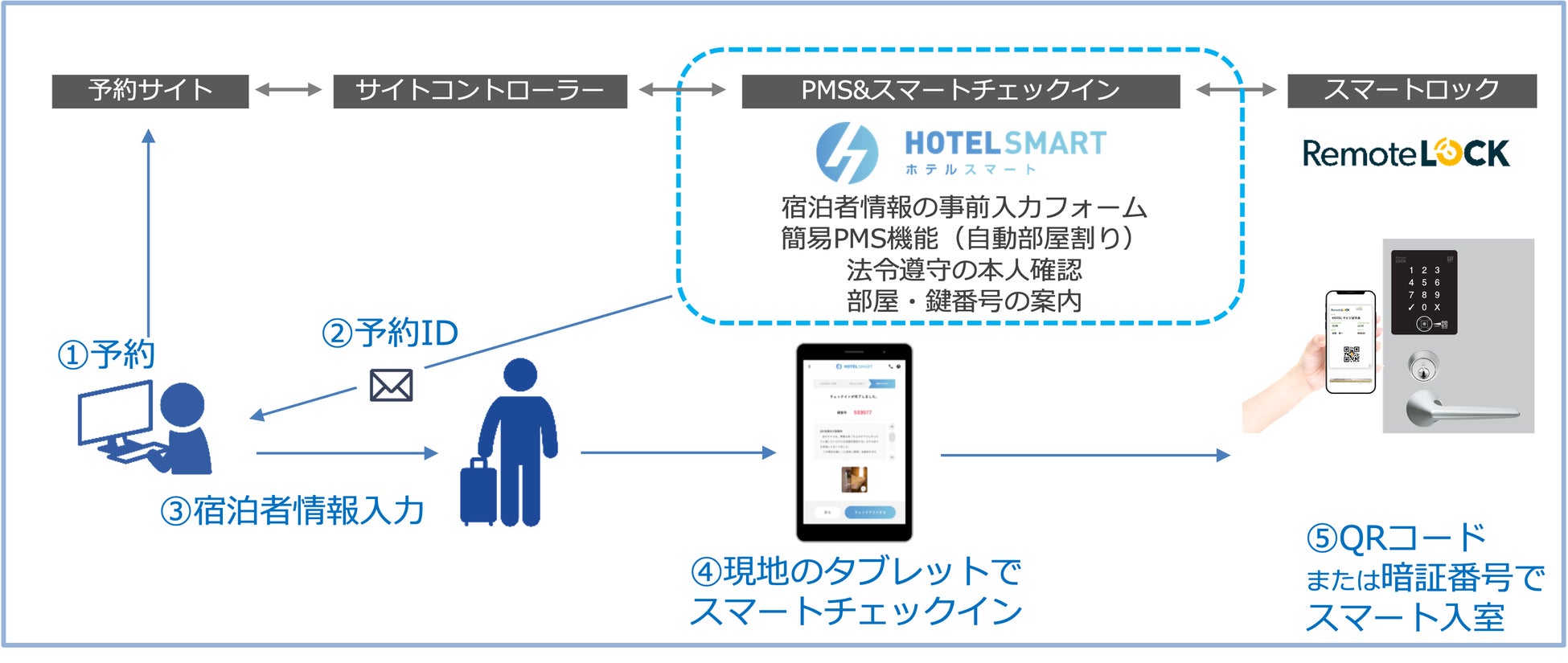 HOTELSMARTは旅前から旅後までを一気通貫でサポートするホテルシステム・セルフチェックインとして、無人・省人化やデジタル化といった宿泊業の業務改善を支援してまいります。