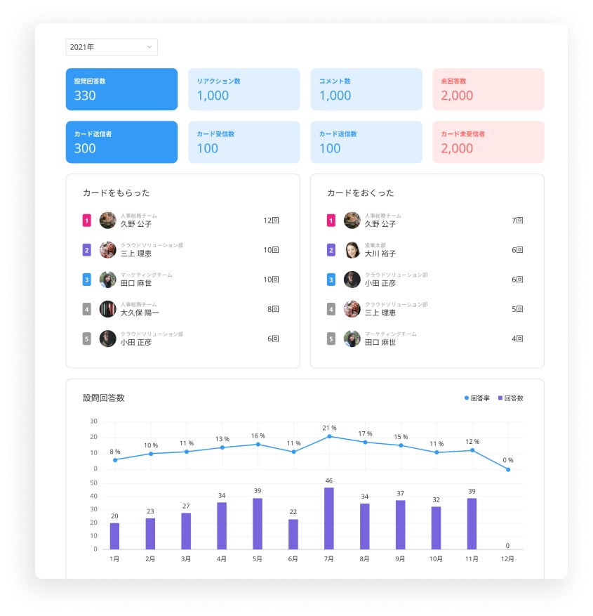 自身のプロフィールページでは、送ったカードの数や受け取ったカードの数、関連するキーワードを確認。自身のどのような行動が評価されているのか、どのくらい企業理念を体現できているのか、これまでの行動量の変化を気軽に確認することができます。