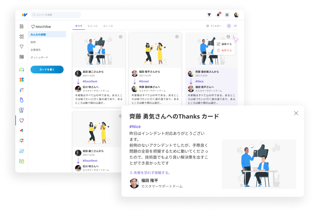 仲間や部下に「ありがとう」「助かった!」等の気持ちを、Thanksカードで送信。本人は意識していないような活躍も、付箋を貼るような手軽さで他のメンバーへ伝えられます。Thanksカードは企業理念に基づく行動も評価でき、理念を意識した行動を自然と促します。