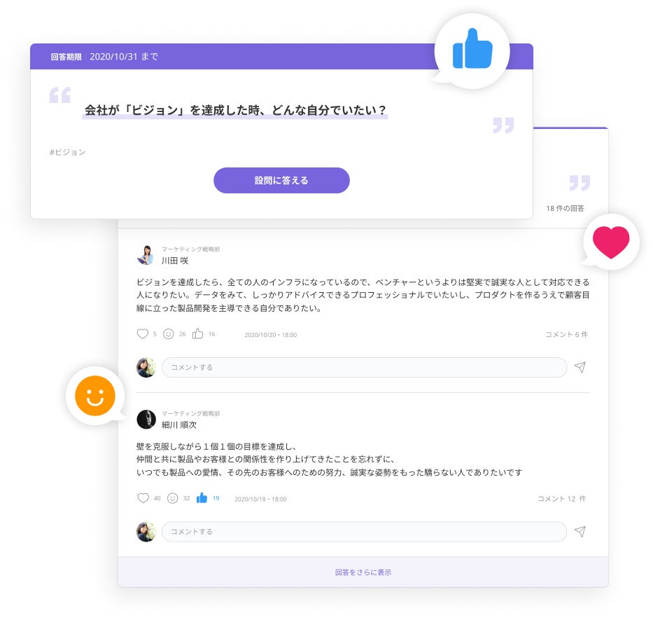 月に1度、企業理念や働くことに対する想いを引き出す設問にみんなで回答。そこで見えてくる考えや想いにすべてのメンバーが触れることで、組織らしさを形づくる企業理念への理解が深まります。