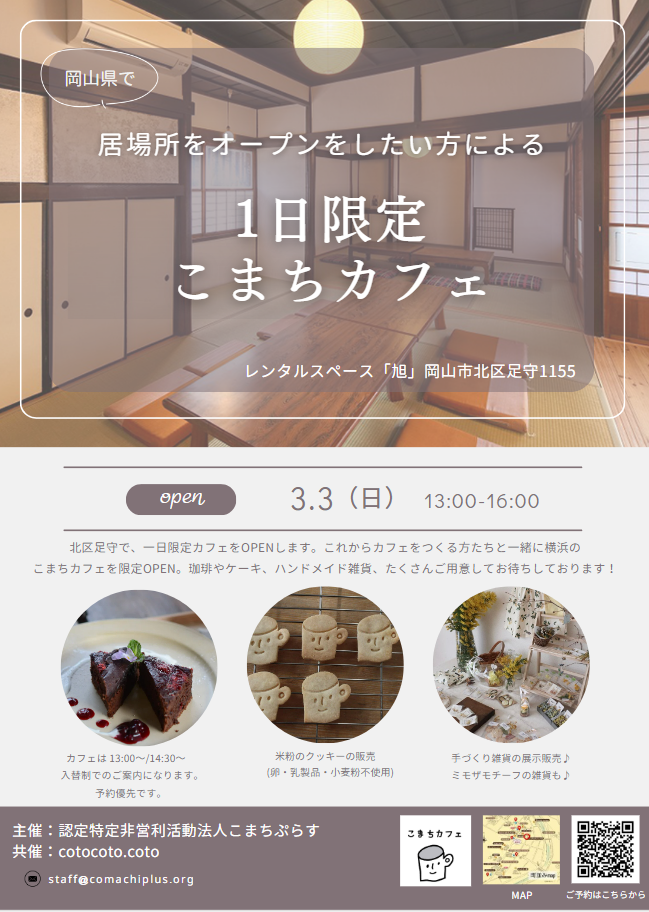 是非その岡山で居場所づくりをしようとされている方々のことを知りたい方、応援をしたい方、居場所づくりを考えていらっしゃる方、「こまちカフェ」やこまちぷらすの居場所づくりに関心がある方、そしてカフェタイムを楽しみたい皆さんのお越しをお待ちしております。