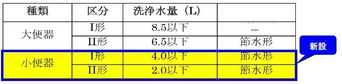 小便器の洗浄水量区分「Ⅰ形(4L以下)/Ⅱ形(2L以下)」が新設されました。