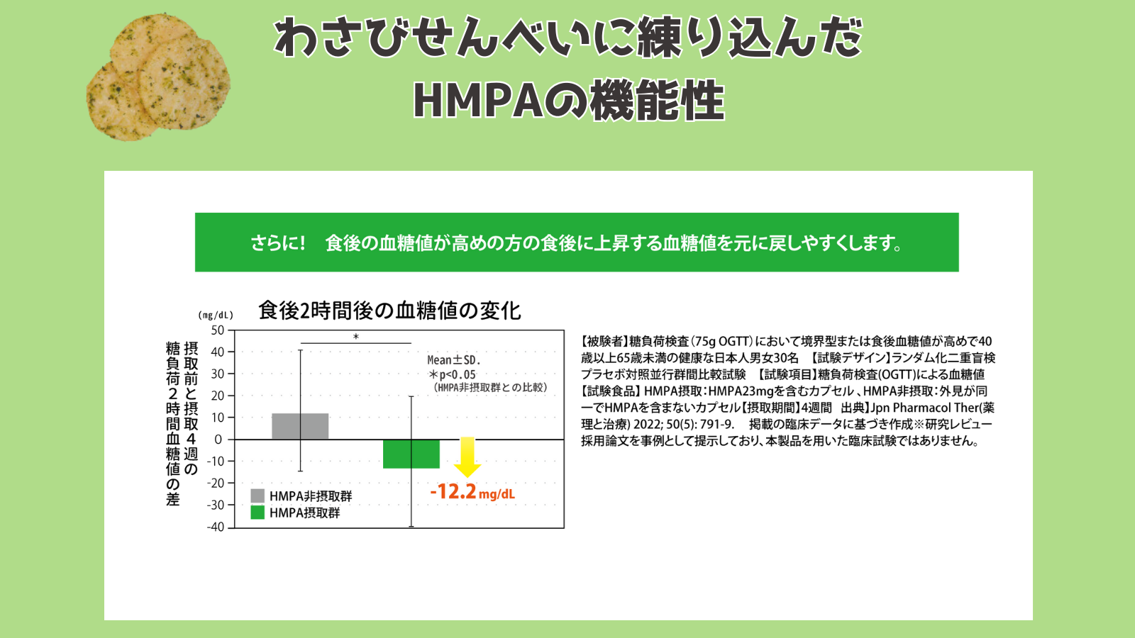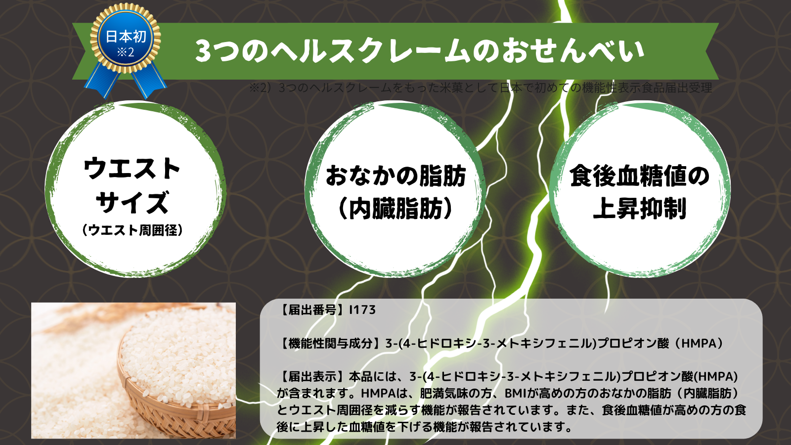 ③食後血糖値が高めの方の食後に上昇した血糖値を下げる、お米由来のポリフェノールである機能性関与成分:3-(4-ヒドロキシ-3-メトキシフェニル)プロピオン酸(HMPA)を配合した、3つのヘルスクレームをもった日本初(※2)のおせんべいです。