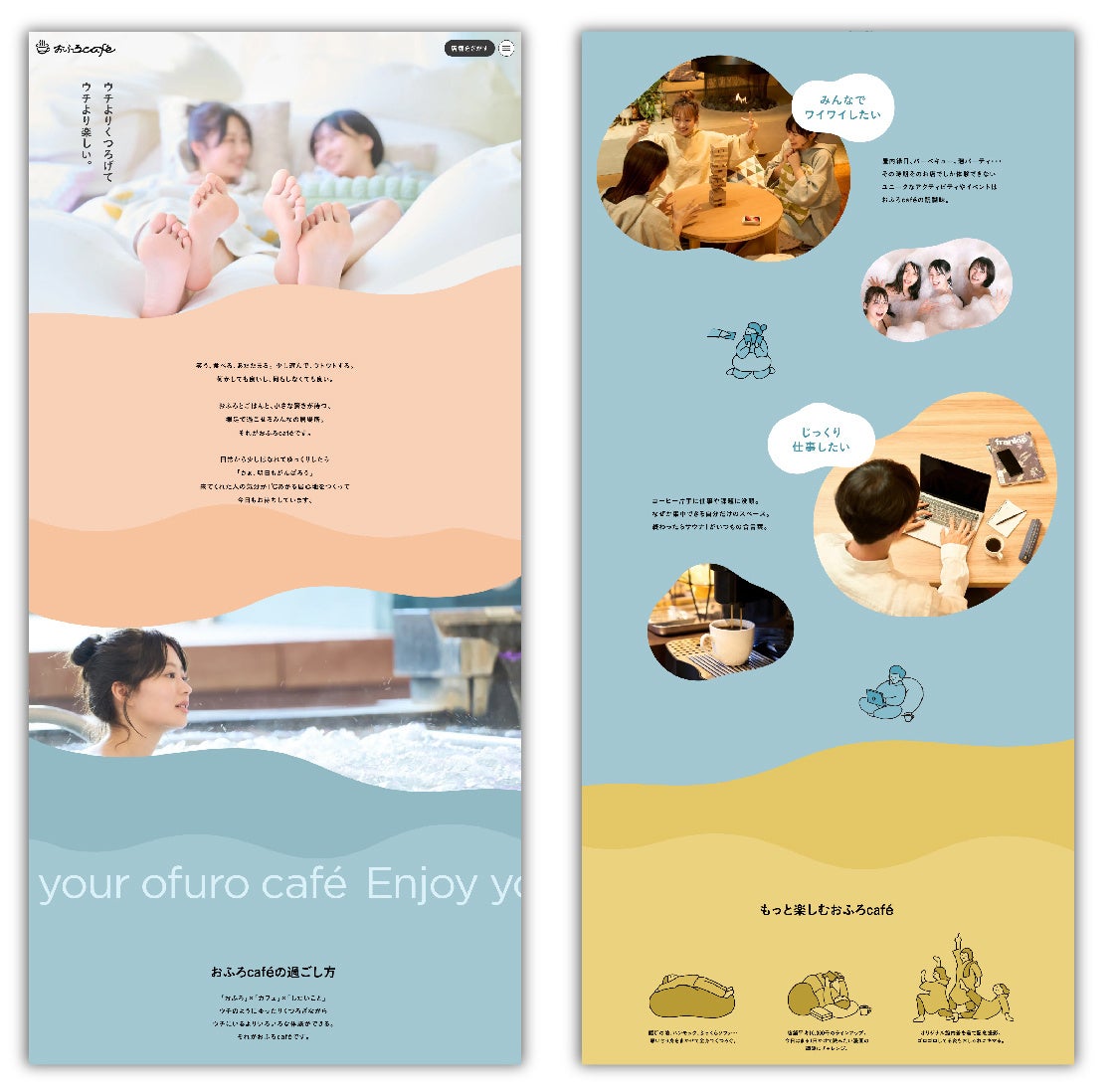 個別にある各「おふろcafé」店舗WEBサイトの入り口となる「おふろcafé共通サイト」を開発。時間を忘れてリラックスできる様子をゆらゆらとした曲線で表現しながら、イラストやビジュアルで「おふろcafé」全体の楽しみ方を、わかりやすく紹介しています。