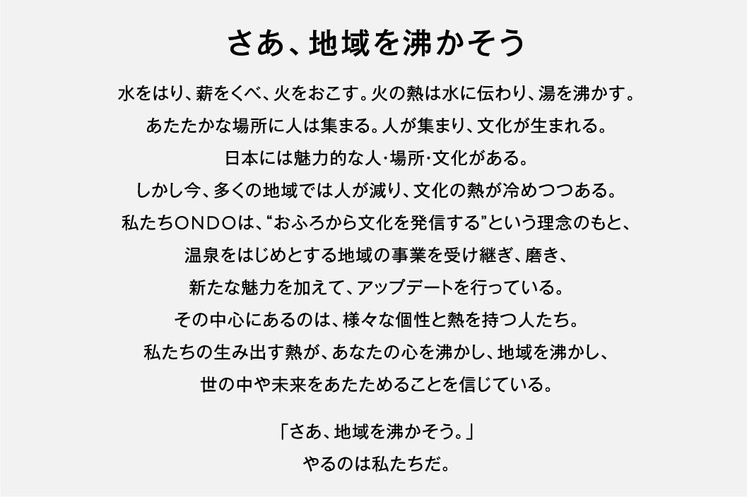 ONDOホールディングス、および温泉道場におけるあらゆる活動の判断基準として、ブランドコンセプト「さあ、地域を沸かそう」を開発。地域の温度を上げる・地域を盛り上げる事業づくりを目指す姿勢を表現しています。