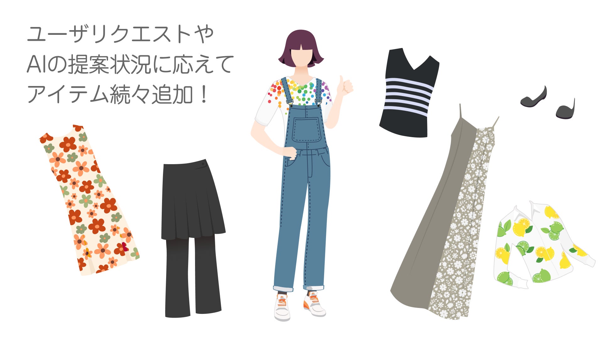 ユーザからのアイテムリクエストをうけて、あるいはAIからの提案を参考に、コーディネートのアイテムは随時追加してきました。これにより、さらに多様でバリエーションゆたかなコーディネートを提案できるようになっています。アイテムは今後も追加し続けていく予定です。
