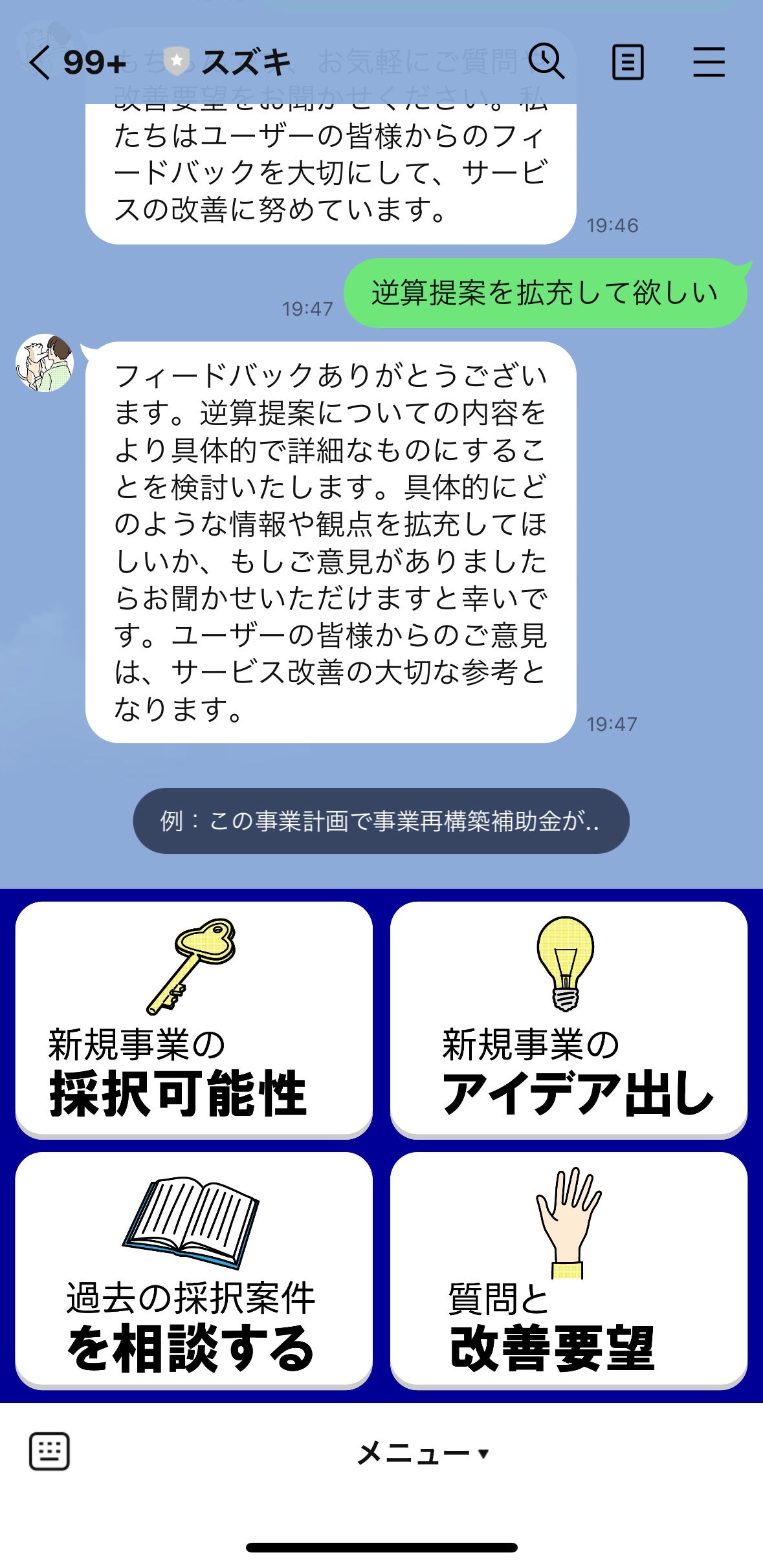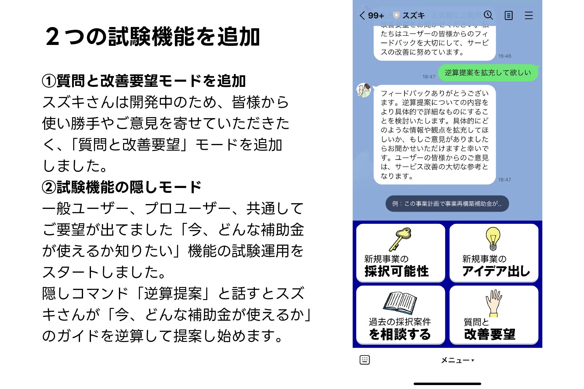 隠しコマンド『逆算提案』をAI派遣スタッフ「スズキさん」に話すことで、代表的な補助金を案内するモードが起動します。※こちらは、開発中でまだまだ至らない機能のため、スズキさんは隠しコマンドのみで受け付けます。